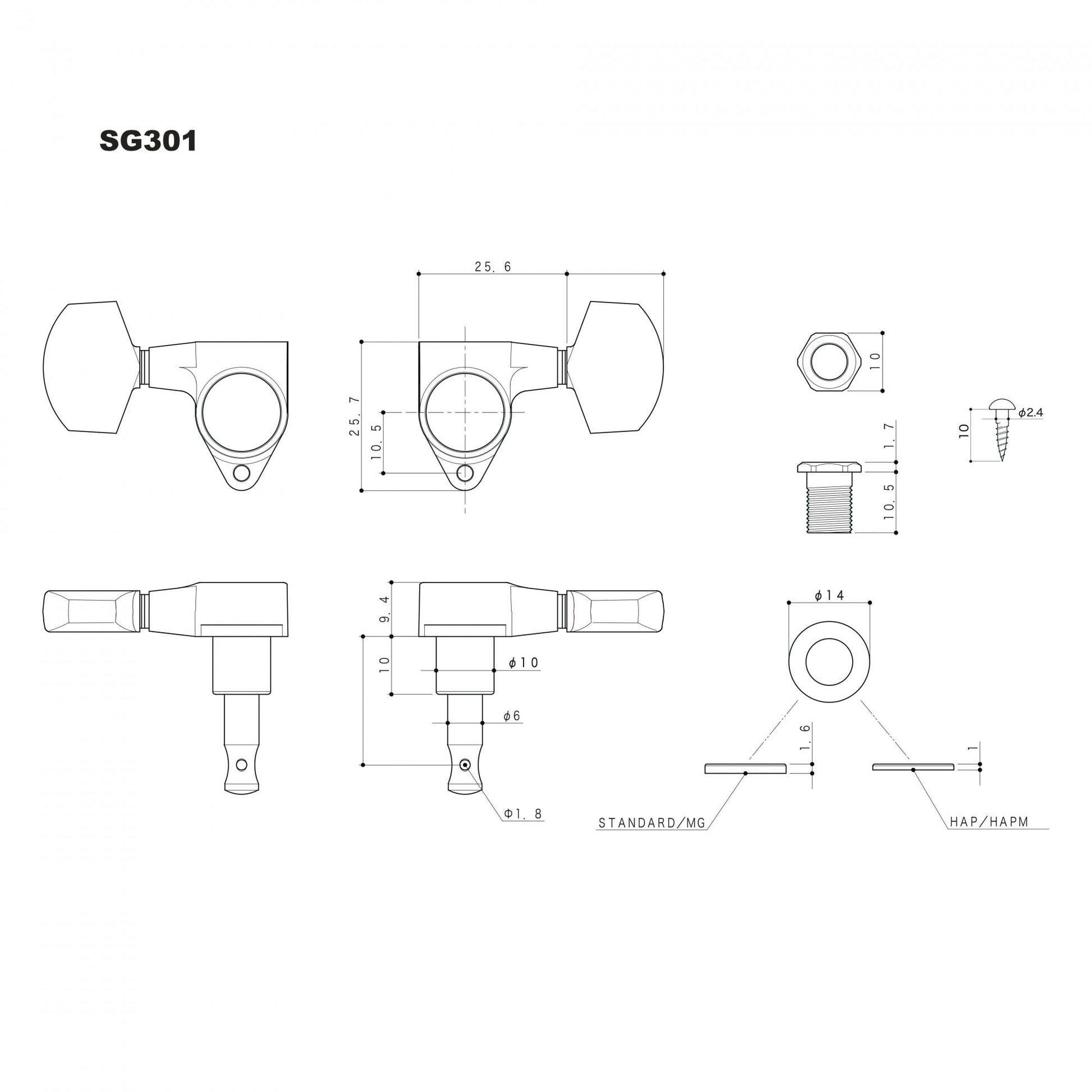 Gotoh 301 Series Tuners. 3 Aside. Set of six. 18:1 ratio. Will fit headstock holes that are drilled out to 10mm diameter. Featuring Gotoh's revolutionary Rock Solid posts for unrivalled tuning stability and "Lubri-Coat" technology that reduces friction between the gears resulting in an ultra smooth feel and minimal back lash. Screws, washers and bushes included.