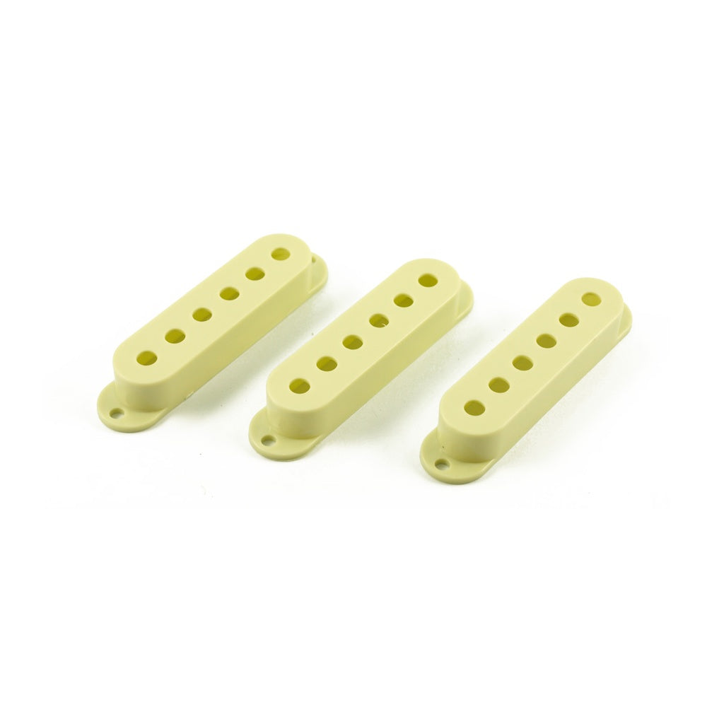 StratÌ´® Plastic Singlecoil pick-up covers. Vintage Mint Green. Ideal for making your guitar look aged. 52mm spacing centre to centre of the two outer polepieces. 77mm centre to centre of the two mounting holes.
