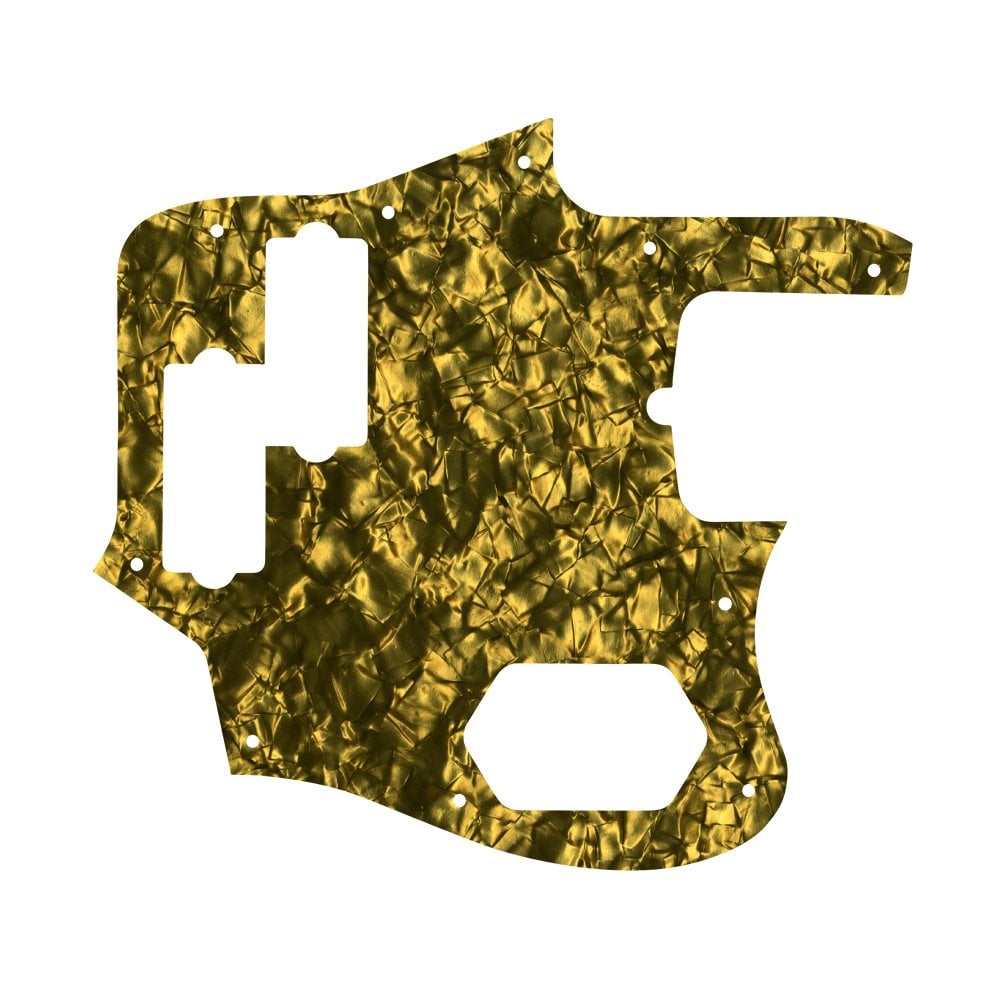 This pickguard is designed to fit a American Standard Jaguar Bass model only. Comes with a 45 degree bevelled edge. Comprises of gold pearl, black, white, black layers.