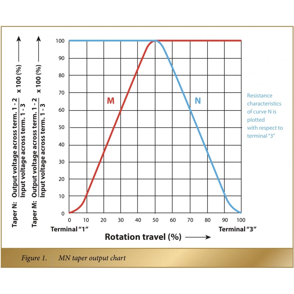 • Element #1 has a linear output increasing from 0 % to 100 % output over 50 % of the mechanical travel in the clockwise direction. The element then stays at 100 % output for the remaining 50 % of mechanical travel. This output curve is identified in the taper output chart as the “M” taper. (please see secondary image for the output chart)
