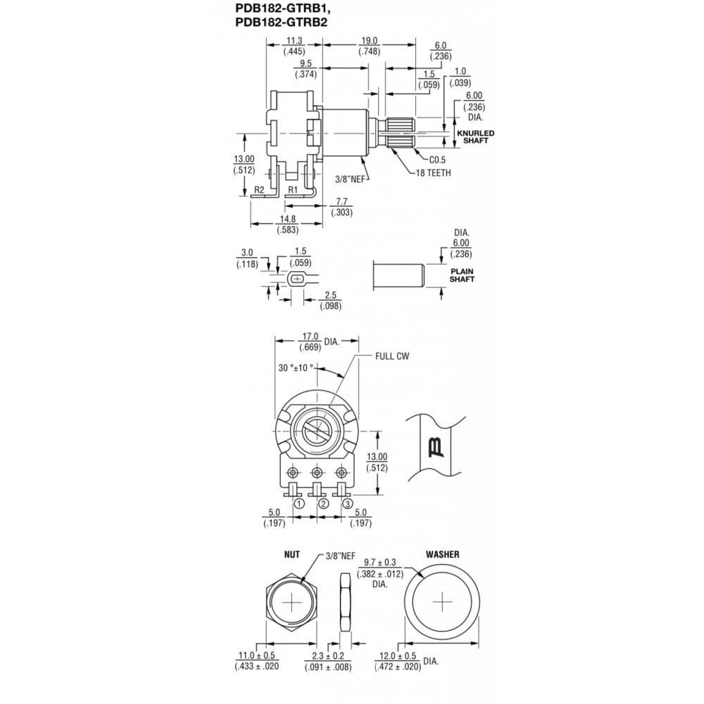 Bourns Blend pot, mini with centre detent, metric 18 spline knurled shaft, 250K linear M & N taper, carbon element, US spec. bushing, ± 20% tolerance. Priced and sold as one individual pot with nut and washer included.