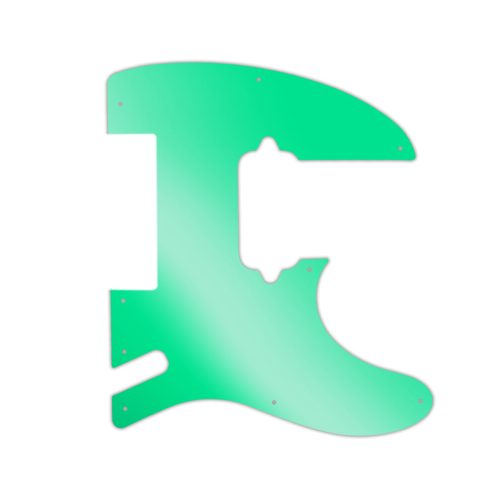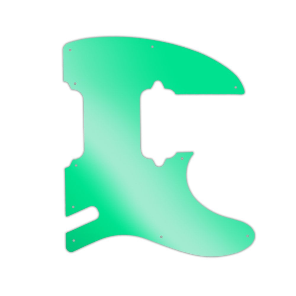 This pickguard is made from green mirror - a clear acrylic material measuring .118" / 2.99mm thick with a 45 degree bevelled edge. The green reflective layer is attached to the underside of the acrylic, preventing it from getting scratched or dented once it is fitted to the instrument.