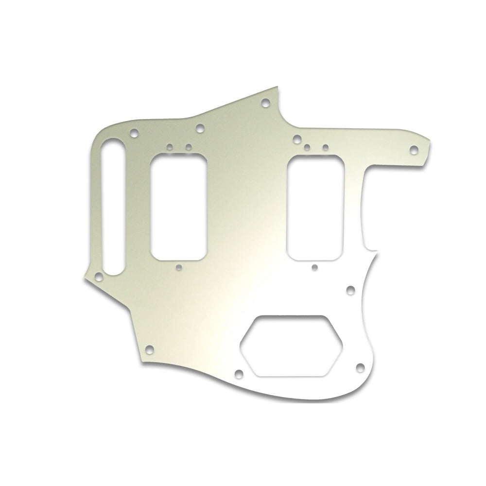 This pickguard is made from silver mirror - a clear acrylic material measuring .118" / 2.99mm thick with a 45 degree bevelled edge. The silver reflective layer is attached to the underside of the acrylic, preventing it from getting scratched or dented once it is fitted to the instrument.
