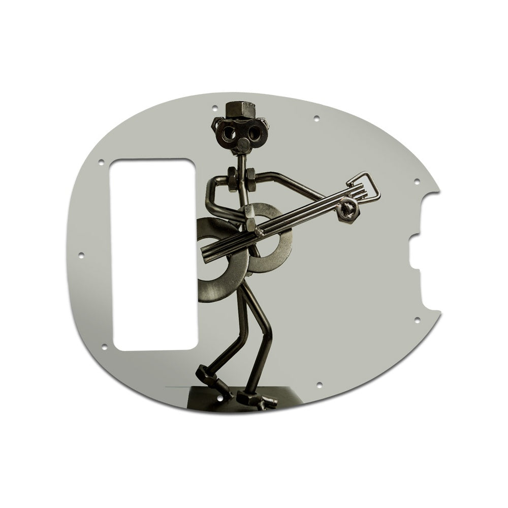 This pickguard is made from silver mirror - a clear acrylic material measuring .118" / 2.99mm thick with a 45 degree bevelled edge. The silver reflective layer is attached to the underside of the acrylic, preventing it from getting scratched or dented once it is fitted to the instrument.