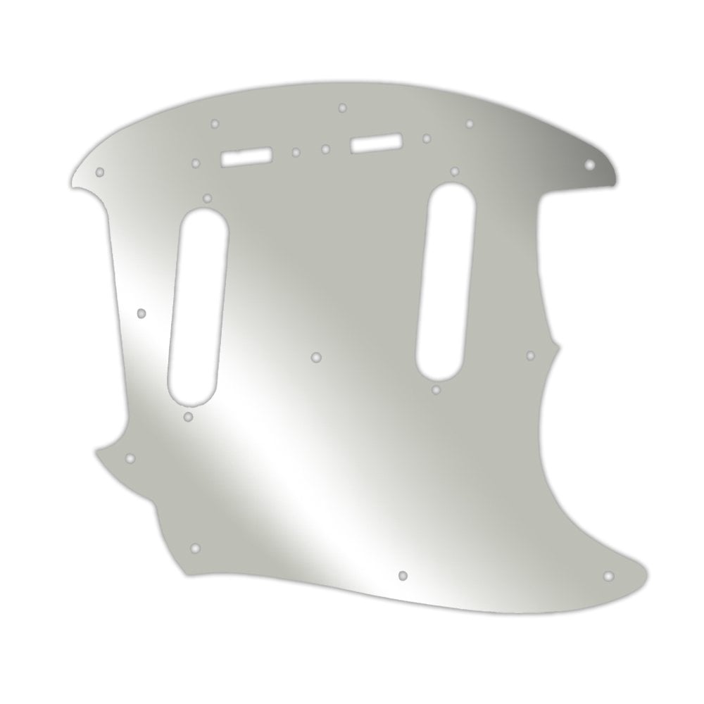 This pickguard is made from silver mirror - a clear acrylic material measuring .118" / 2.99mm thick with a 45 degree bevelled edge. The silver reflective layer is attached to the underside of the acrylic, preventing it from getting scratched or dented once it is fitted to the instrument.