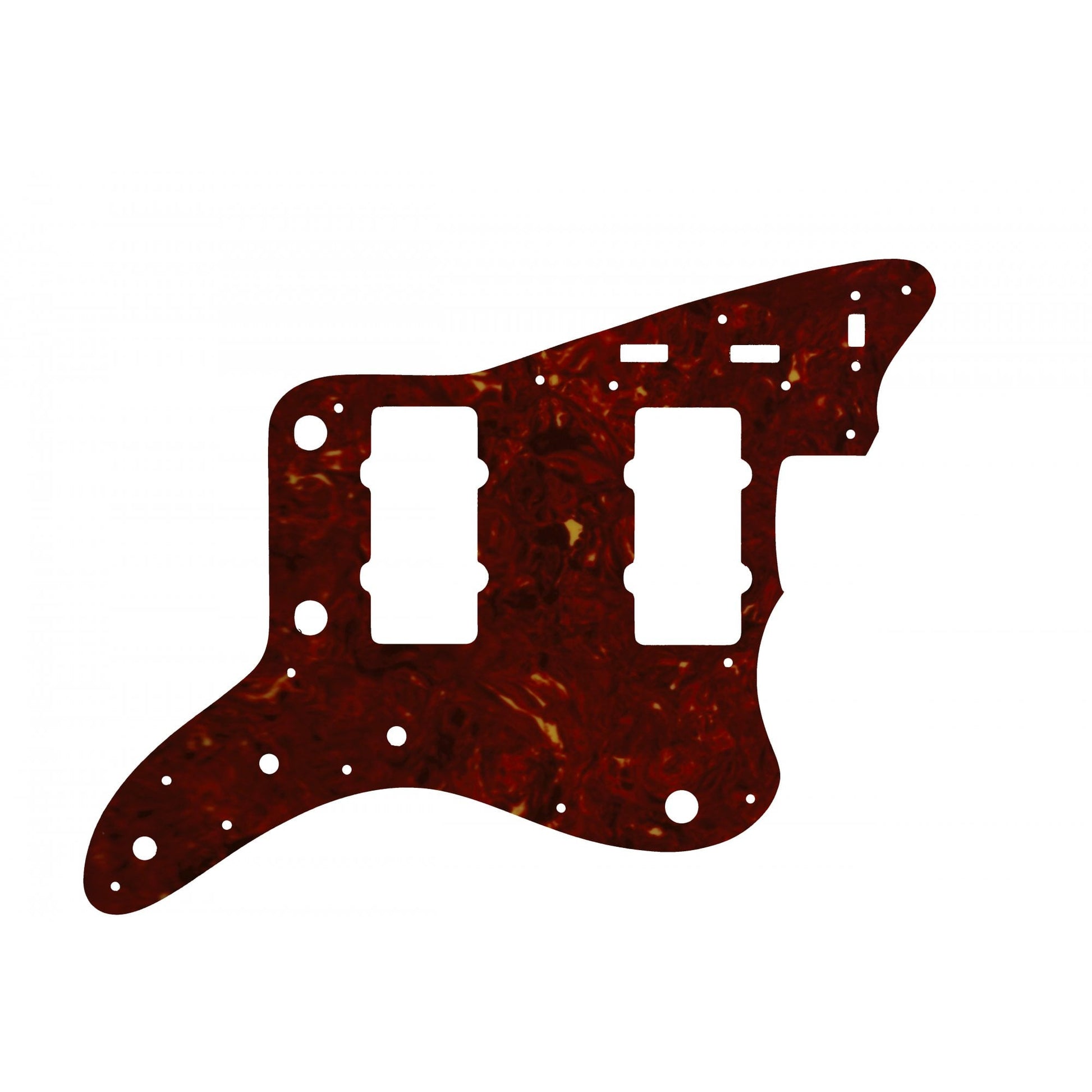 This replacement pickguard is made to fit the Fender Jazzmaster Made In Japan 1966-1968 Reissue model only. Light brown tortoiseshell (with a hint more red to the overall colour compared to the dark brown tortoiseshell that we sell) celluloid top layer with a PVC White / Black / White laminate underneath. Comes with a peel-off clear protective film attached to top side to protect the surface during cutting and installation. We are unable to accept returns if this clear film has been removed.