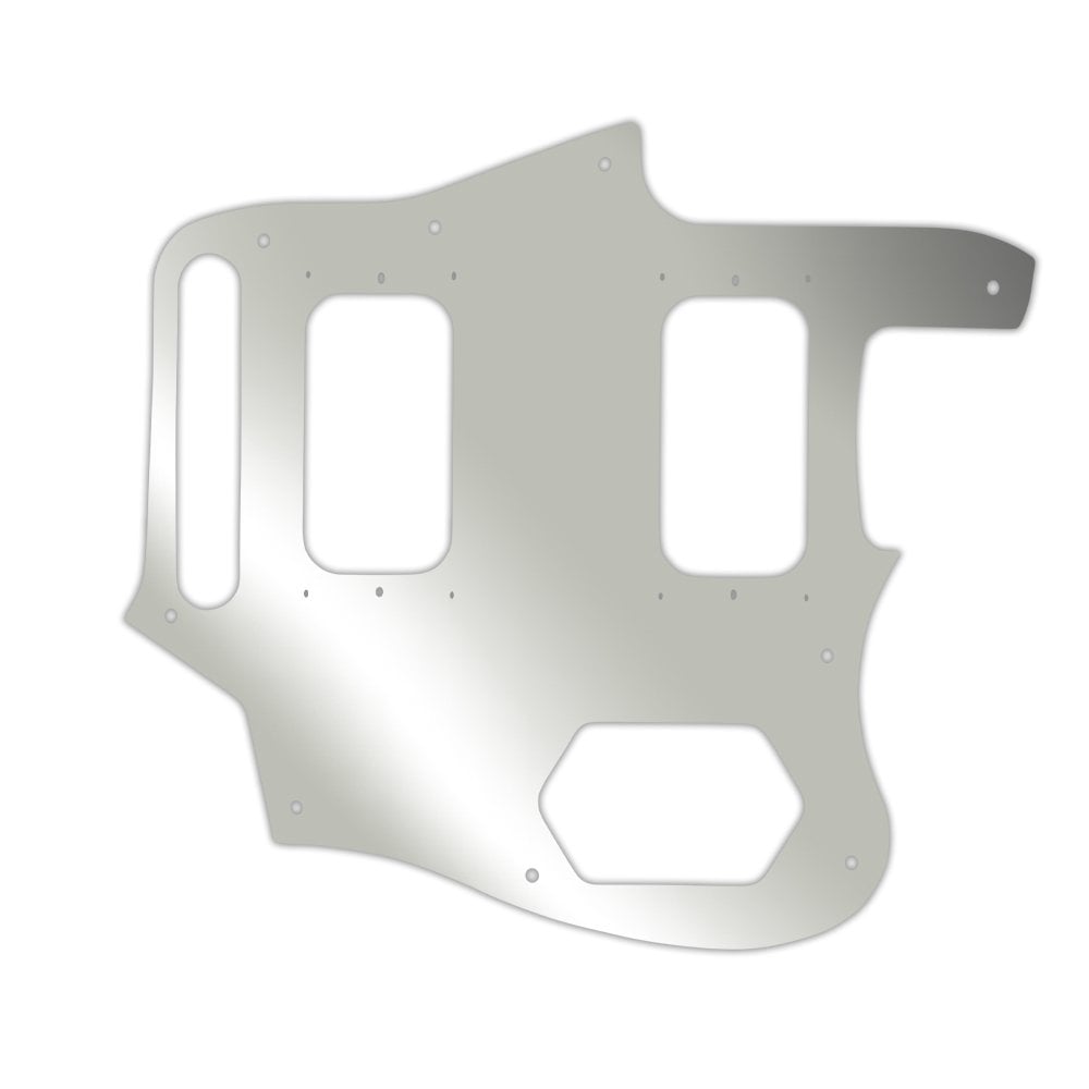 This pickguard is made from silver mirror - a clear acrylic material measuring .118" / 2.99mm thick with a 45 degree bevelled edge. The silver reflective layer is attached to the underside of the acrylic, preventing it from getting scratched or dented once it is fitted to the instrument.