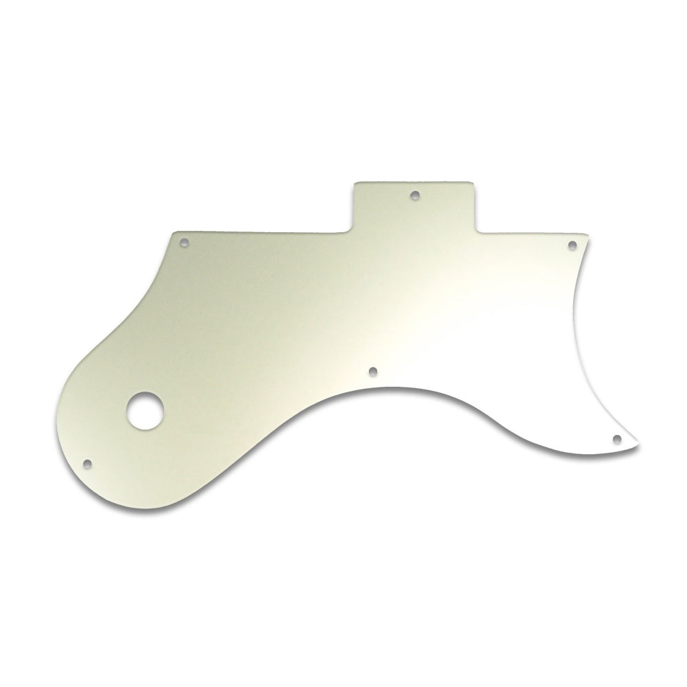 This pickguard is made from silver mirror - a clear acrylic material measuring .118" / 2.99mm thick with a 45 degree bevelled edge. The silver reflective layer is attached to the underside of the acrylic, preventing it from getting scratched or dented once it is fitted to the instrument.