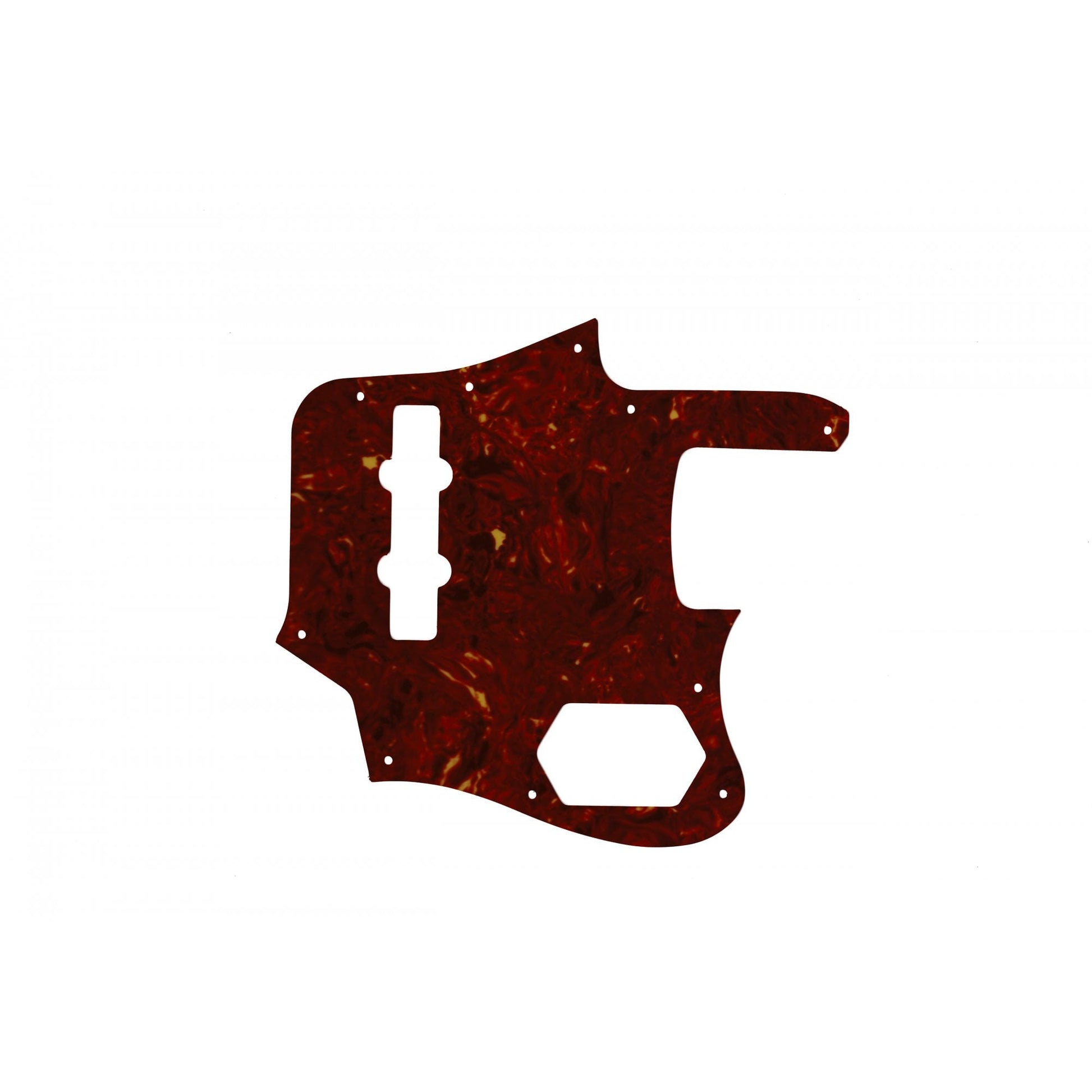 This pickguard is designed to fit a Made In Japan Deluxe Jaguar Bass 2012 - 2013 model only. Light brown tortoiseshell (with a hint more red to the overall colour compared to the dark brown tortoiseshell that we sell) celluloid top layer with a PVC White / Black / White laminate underneath. Comes with a peel-off clear protective film attached to top side to protect the surface during cutting and installation. We are unable to accept returns if this clear film has been removed.