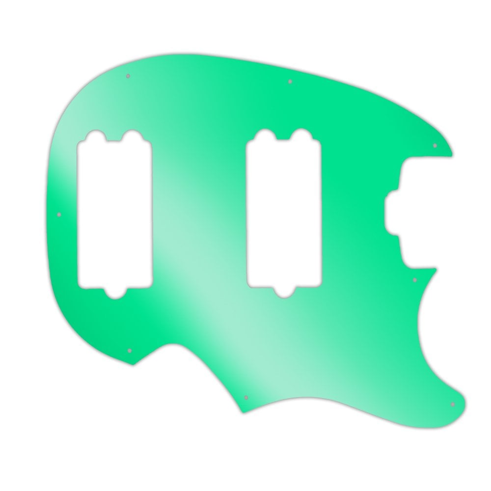 This pickguard is made from green mirror - a clear acrylic material measuring .118" / 2.99mm thick with a 45 degree bevelled edge. The green reflective layer is attached to the underside of the acrylic, preventing it from getting scratched or dented once it is fitted to the instrument.
