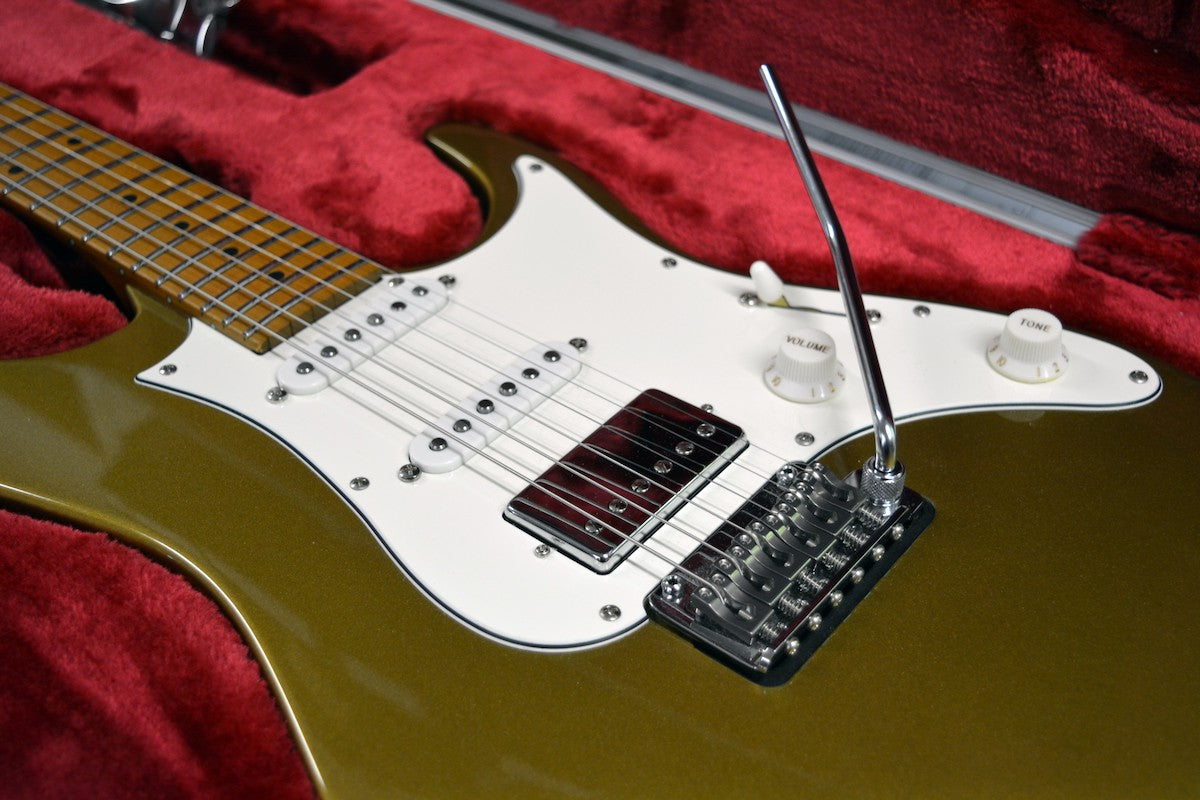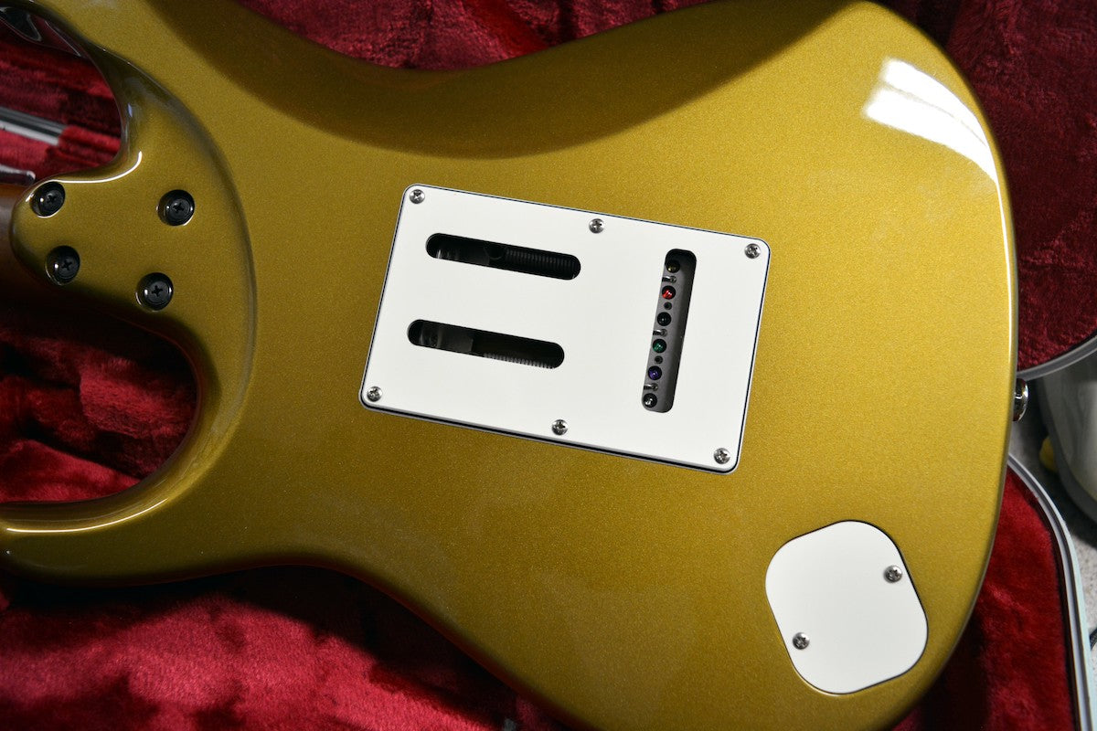 The pickguard includes silver shielding foil around the pot and switch area for reduced interference.