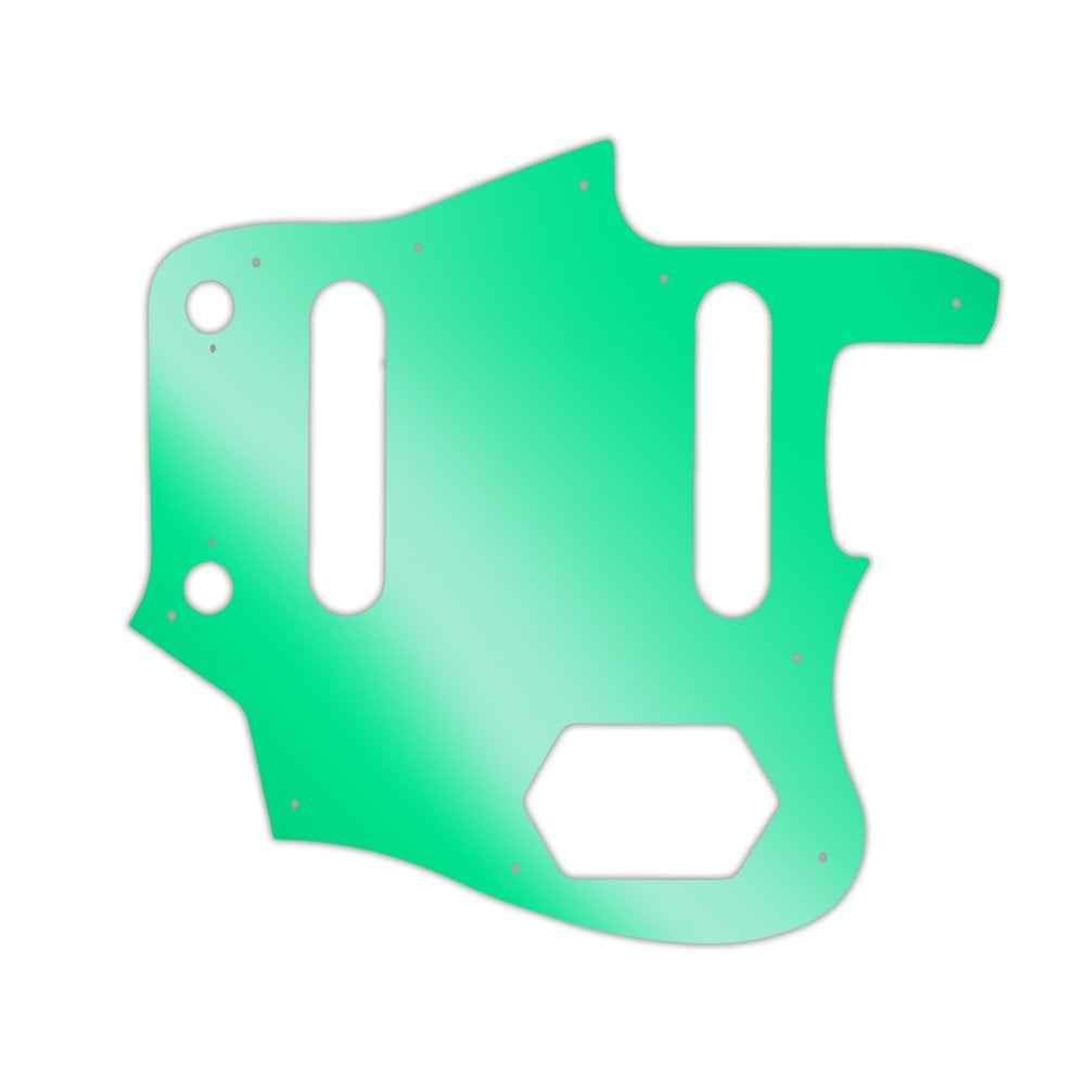 This pickguard is made from green mirror - a clear acrylic material measuring .118" / 2.99mm thick with a 45 degree bevelled edge. The green reflective layer is attached to the underside of the acrylic, preventing it from getting scratched or dented once it is fitted to the instrument.