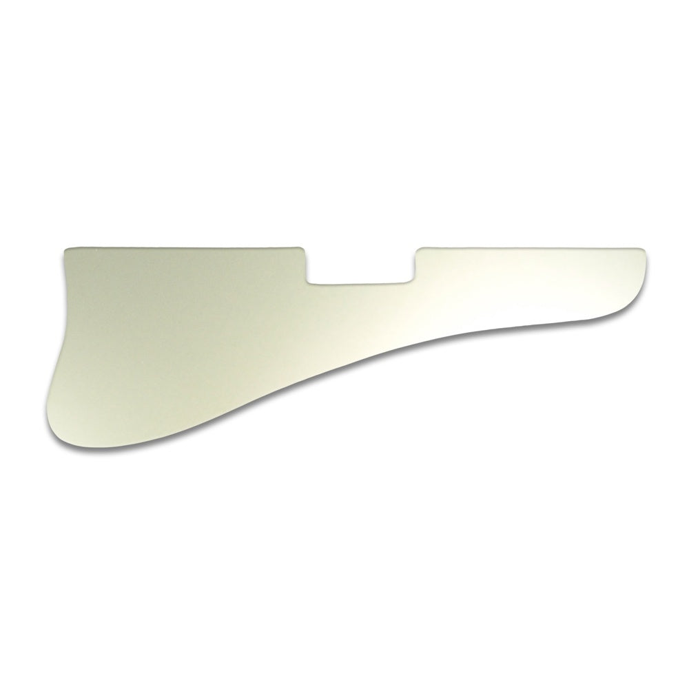 This pickguard is made from silver mirror - a clear acrylic material measuring .118" / 2.99mm thick with a 45 degree bevelled edge. The silver reflective layer is attached to the underside of the acrylic, preventing it from getting scratched or dented once it is fitted to the instrument.