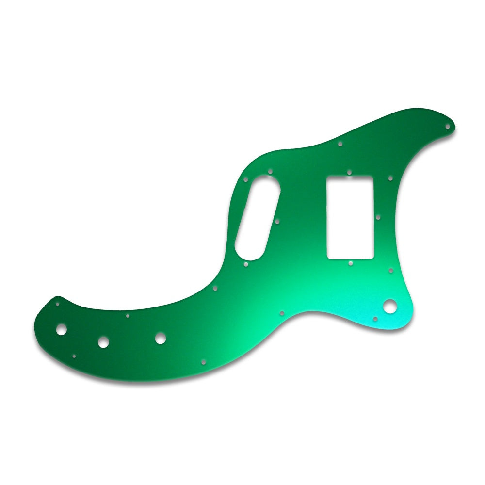 This pickguard is made from green mirror - a clear acrylic material measuring .118" / 2.99mm thick with a 45 degree bevelled edge. The green reflective layer is attached to the underside of the acrylic, preventing it from getting scratched or dented once it is fitted to the instrument.