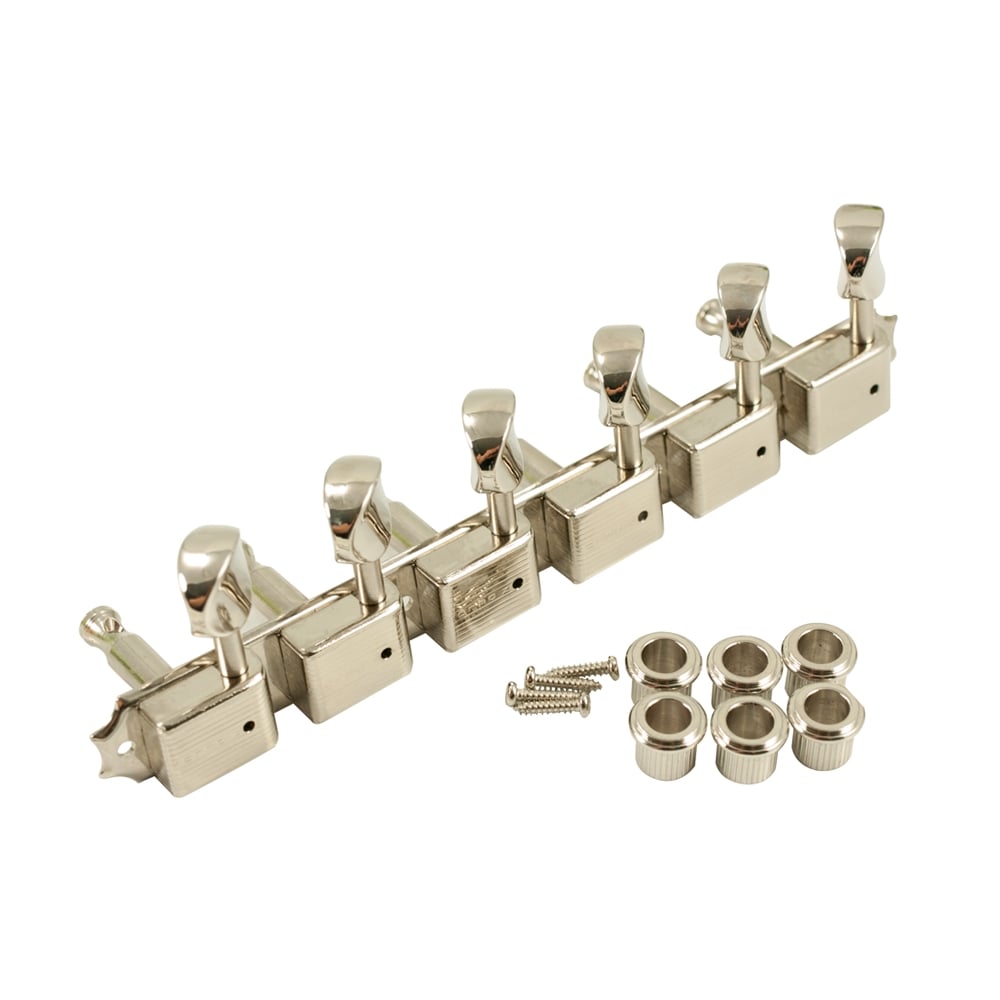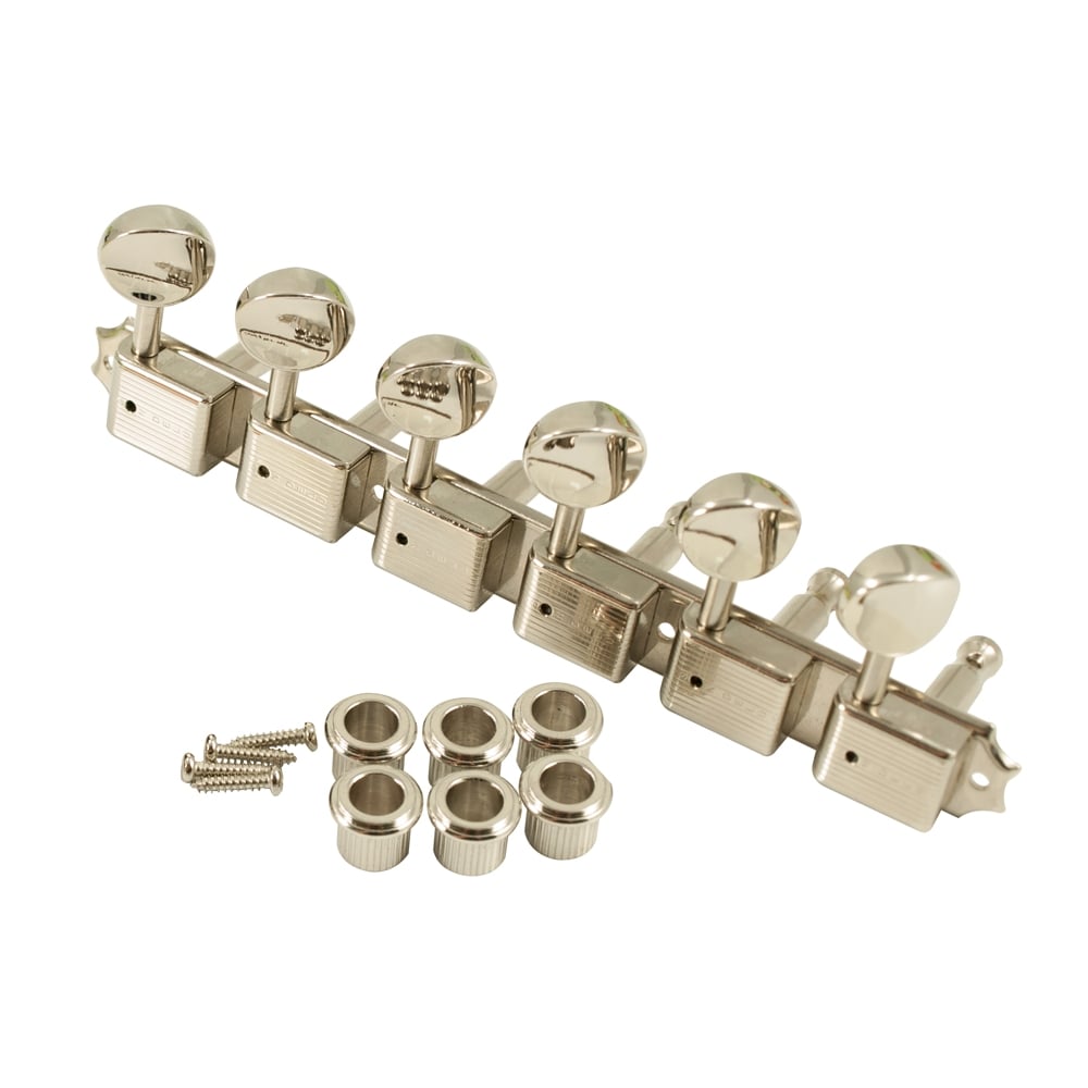 This Kluson plate-mounted 6-in-line tuning machine set has oval metal (butter bean-shaped) buttons and the improved 15:1 gear ratio for more stable and accurate tuning. The housing and button style are period correct for 1956 - 1964 production dates. These feature the standard Kluson string post. This set comes complete with 6 side tuners mounted on a single plate with 29/32 in. post spacing, 8.8mm O.D. vintage bushings with 1/4 inch I.D. (part#MB65N US) and mounting screws (TMSC) needed for installation.
