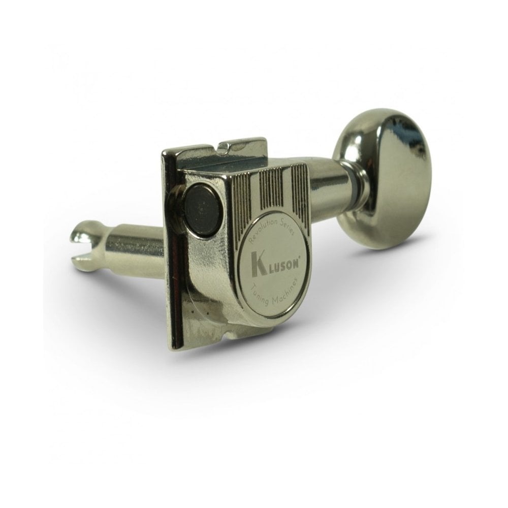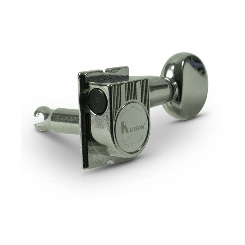 The Kluson Revolution H-Mount 19:1 high ratio tuning machine. A traditional 6 in line footprint with contemporary sealed diecast housing.