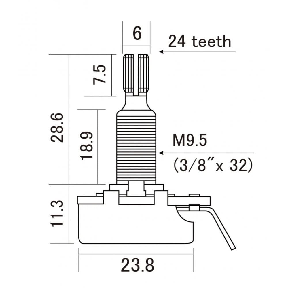 Shaft diameter - 9.5mm (please ensure that the pickguard / control plate that the pot is mounting onto has a 9.6mm diameter hole)