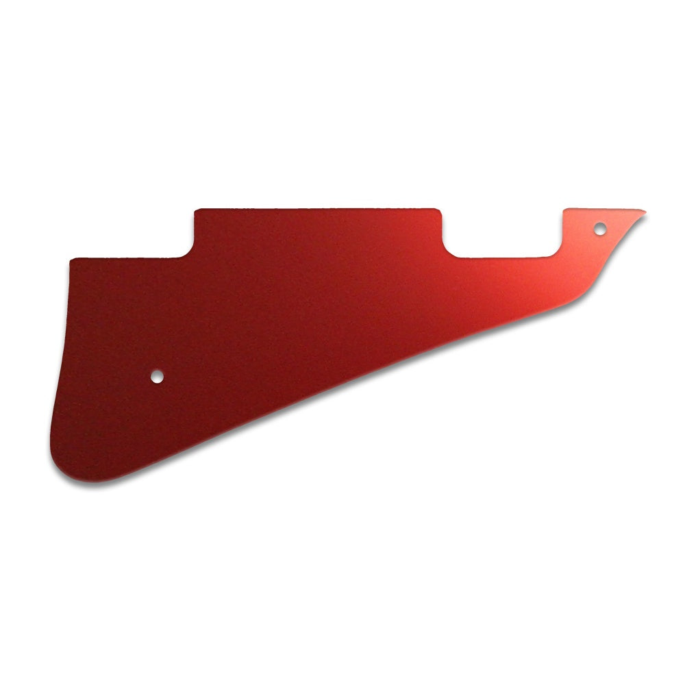 This pickguard is made from red mirror - a clear acrylic material measuring .118" / 2.99mm thick with a 45 degree bevelled edge. The red reflective layer is attached to the underside of the acrylic, preventing it from getting scratched or dented once it is fitted to the instrument.