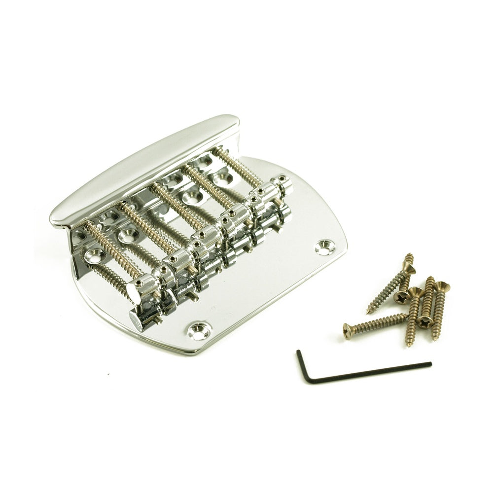 Replacement 5 string bridge for MusicMan Sterling and Stingray. Mounts with 6 screws and strings through the top of the bridge. Does not string through the body. Chrome finish and screws plus allen key included.