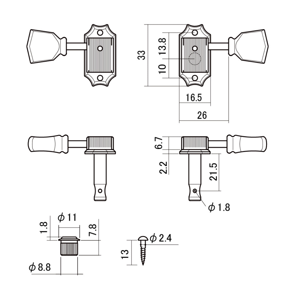 Set of 6 Gotoh tuning machines, 3 per side, 15:1 gear ratio. These high-quality, made-in-Japan machine heads come complete with 8.8mm outer diameter push-fit bushes and mounting screws.