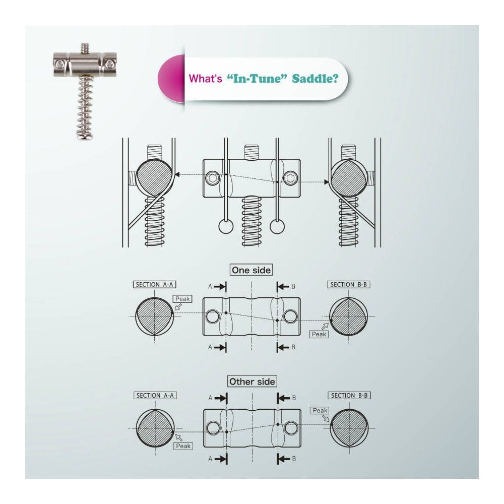 Gotoh's unique saddle grooving on the “In-Tune” saddles results in more exact intonation compared to traditional vintage-style saddles. Each saddle is reversible and can be used in any position. Titanium construction for rich harmonic overtones and long sustain. This bridge is dual string loading, allowing both top loading or through-body stringing options. Gotoh is proud to announce the "In-Tune" saddle!