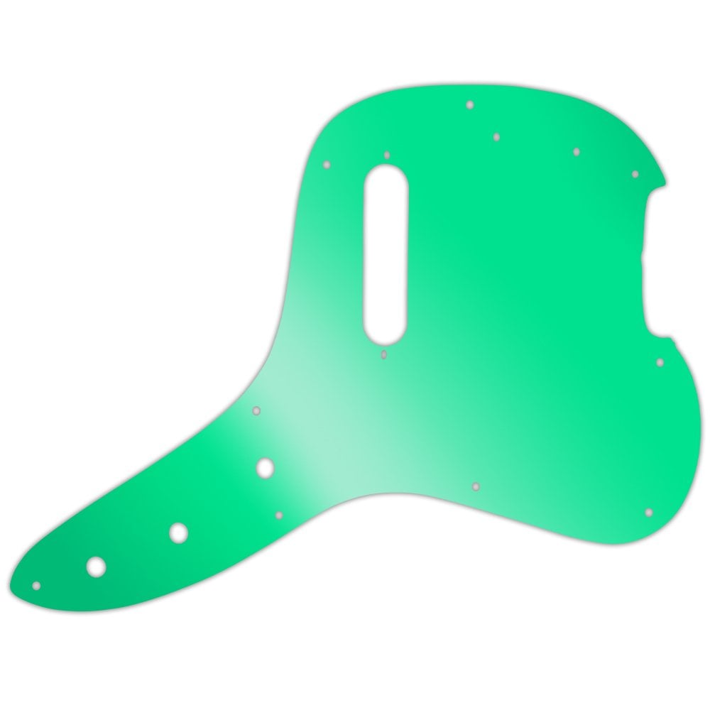This pickguard is made from green mirror - a clear acrylic material measuring .118" / 2.99mm thick with a 45 degree bevelled edge. The green reflective layer is attached to the underside of the acrylic, preventing it from getting scratched or dented once it is fitted to the instrument.