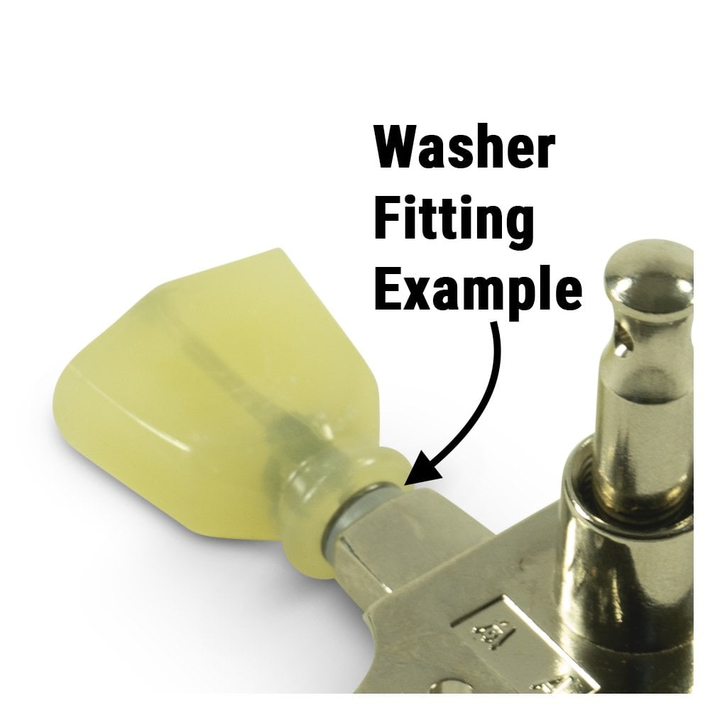This set contains 6 white nylon washers and 6 black metal washers. Typically a nylon and metal washer sit underneath the button on a contemporary-style die cast tuner. These washers will not fit all brands of machine head and we recommend referring to the measurements listed below to ensure that they will fit.