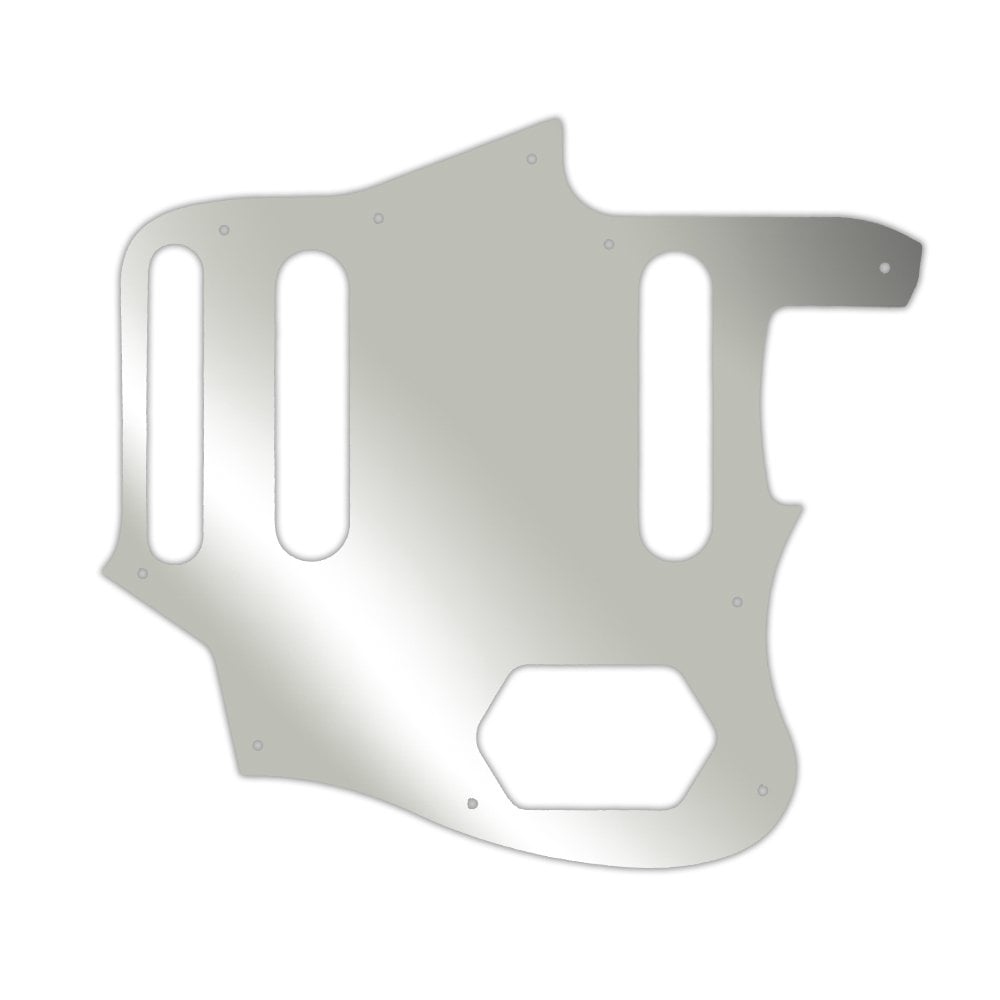 This pickguard is made from silver mirror - a clear acrylic material measuring .118" / 2.99mm thick with a 45 degree bevelled edge. The silver reflective layer is attached to the underside of the acrylic, preventing it from getting scratched or dented once it is fitted to the instrument.