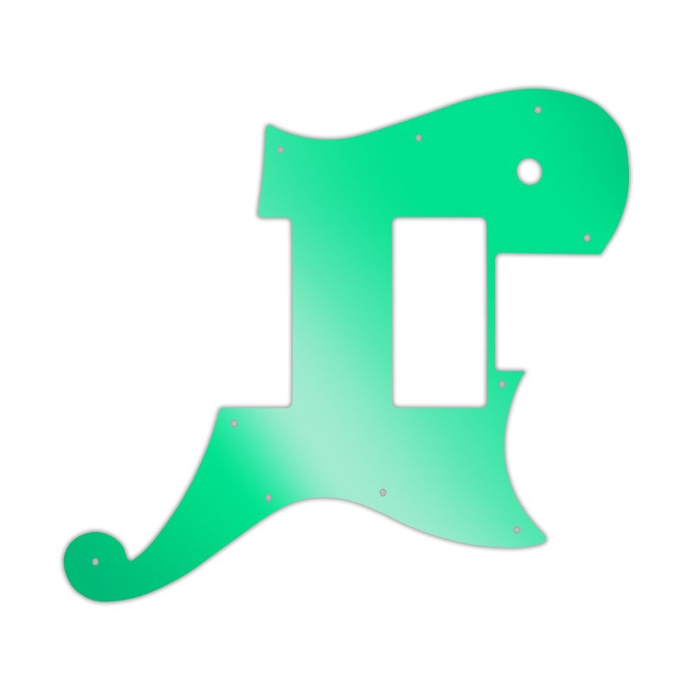 This pickguard is made from green mirror - a clear acrylic material measuring .118" / 2.99mm thick with a 45 degree bevelled edge. The green reflective layer is attached to the underside of the acrylic, preventing it from getting scratched or dented once it is fitted to the instrument.