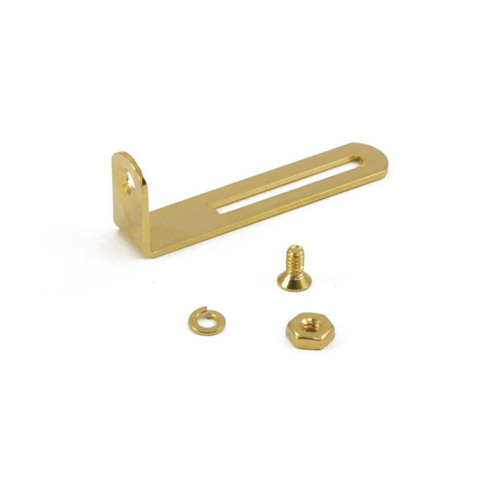 This pickguard mounting bracket is a direct replacement for Historic Gibson Les Paul guitars made at the Nashville Custom Shop. The bracket is made from steel in the USA with high-quality plating to the standards that you would expect. Slight differences include the adjustment slot having square cut ends instead of the contemporary rounded cut slot and a slight difference in width compared to the contemporary version. Comes with mounting screws, washer and nut and available in chrome, nickel or gold finishes.