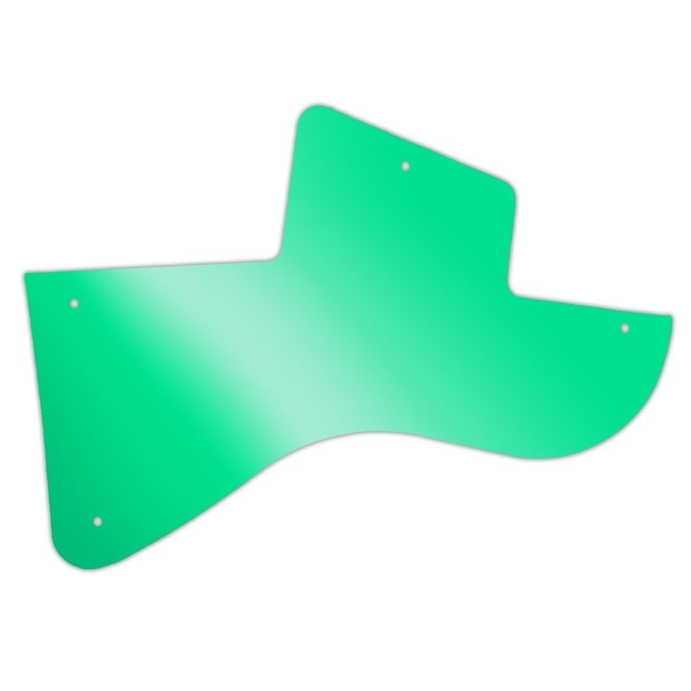This pickguard is made from green mirror - a clear acrylic material measuring .118" / 2.99mm thick with a 45 degree bevelled edge. The green reflective layer is attached to the underside of the acrylic, preventing it from getting scratched or dented once it is fitted to the instrument.