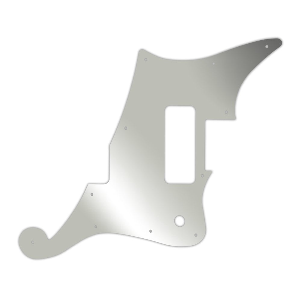 This pickguard is made from silver mirror - a clear acrylic material measuring .118" / 2.99mm thick with a 45 degree bevelled edge. The silver reflective layer is attached to the underside of the acrylic, preventing it from getting scratched or dented once it is fitted to the instrument.