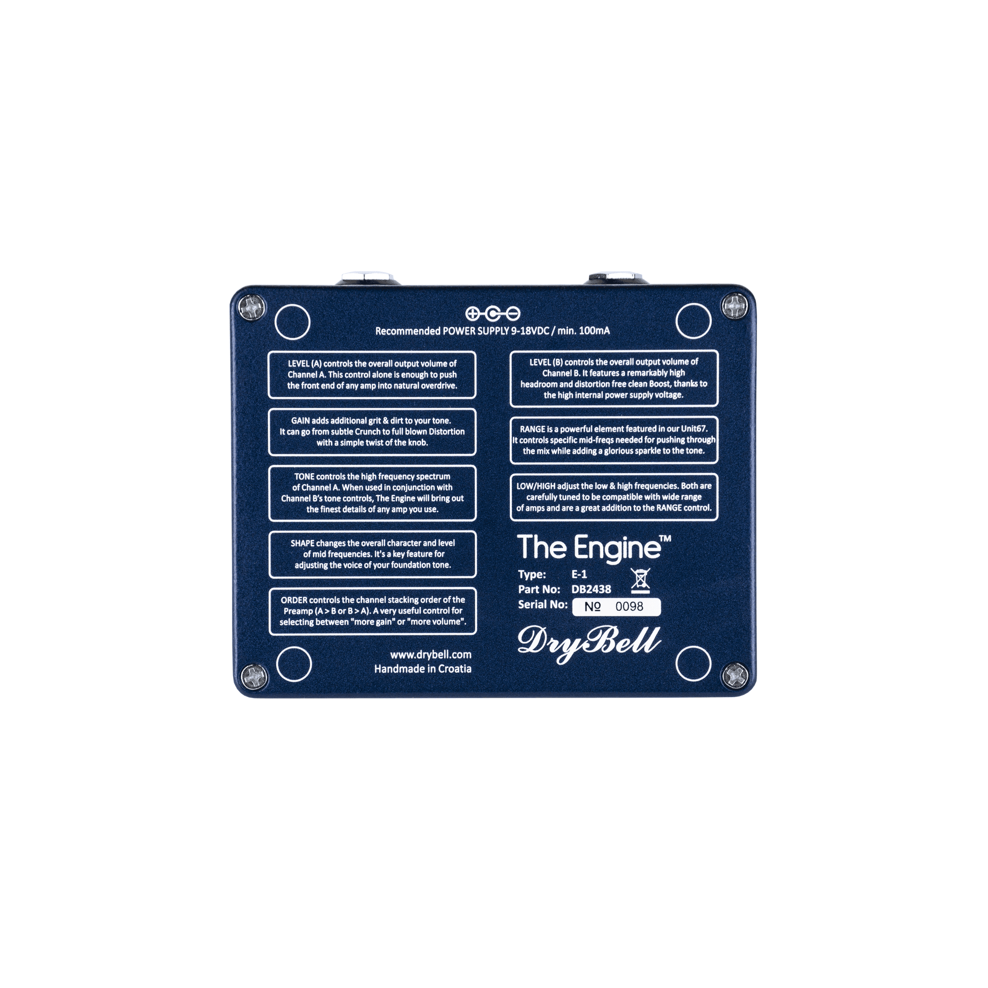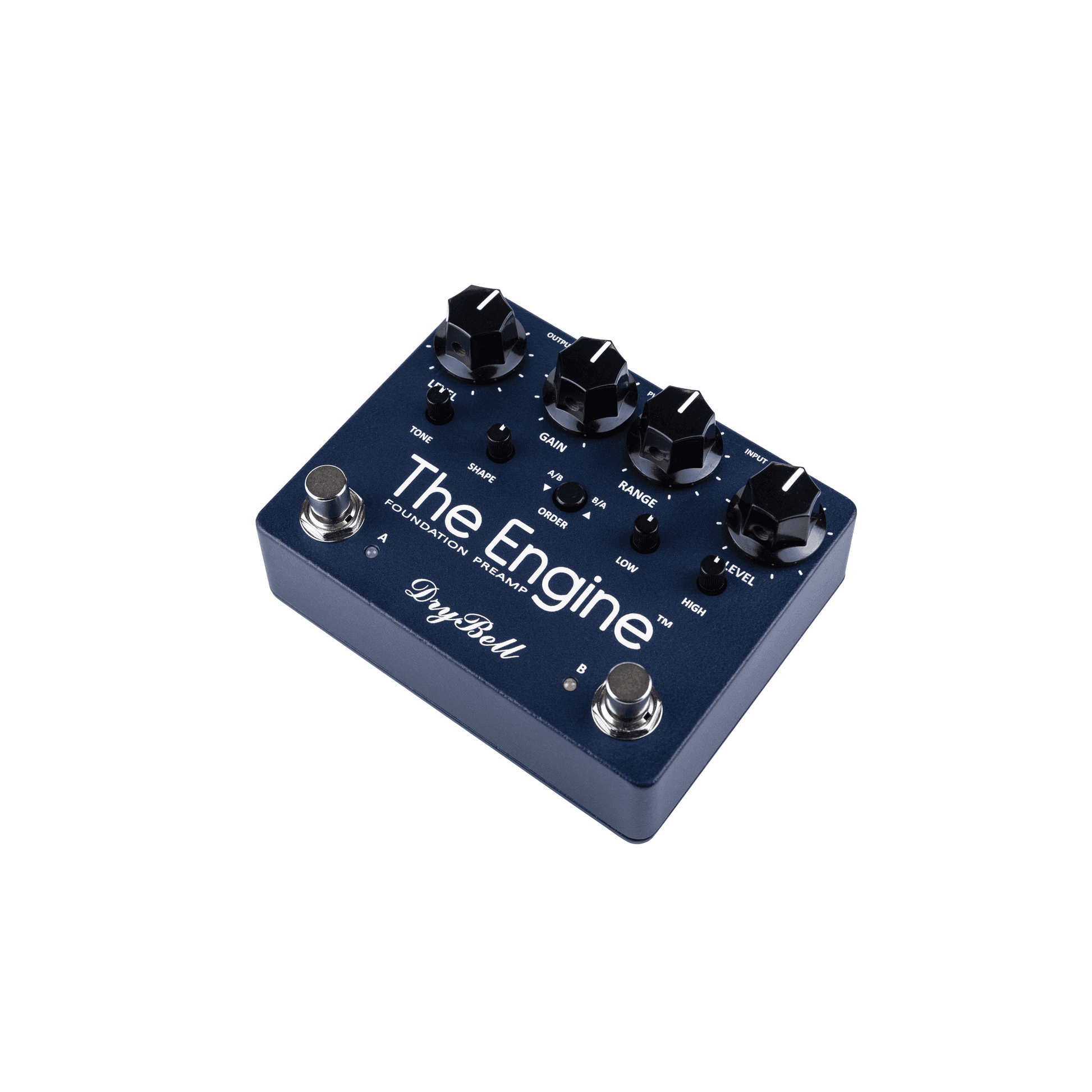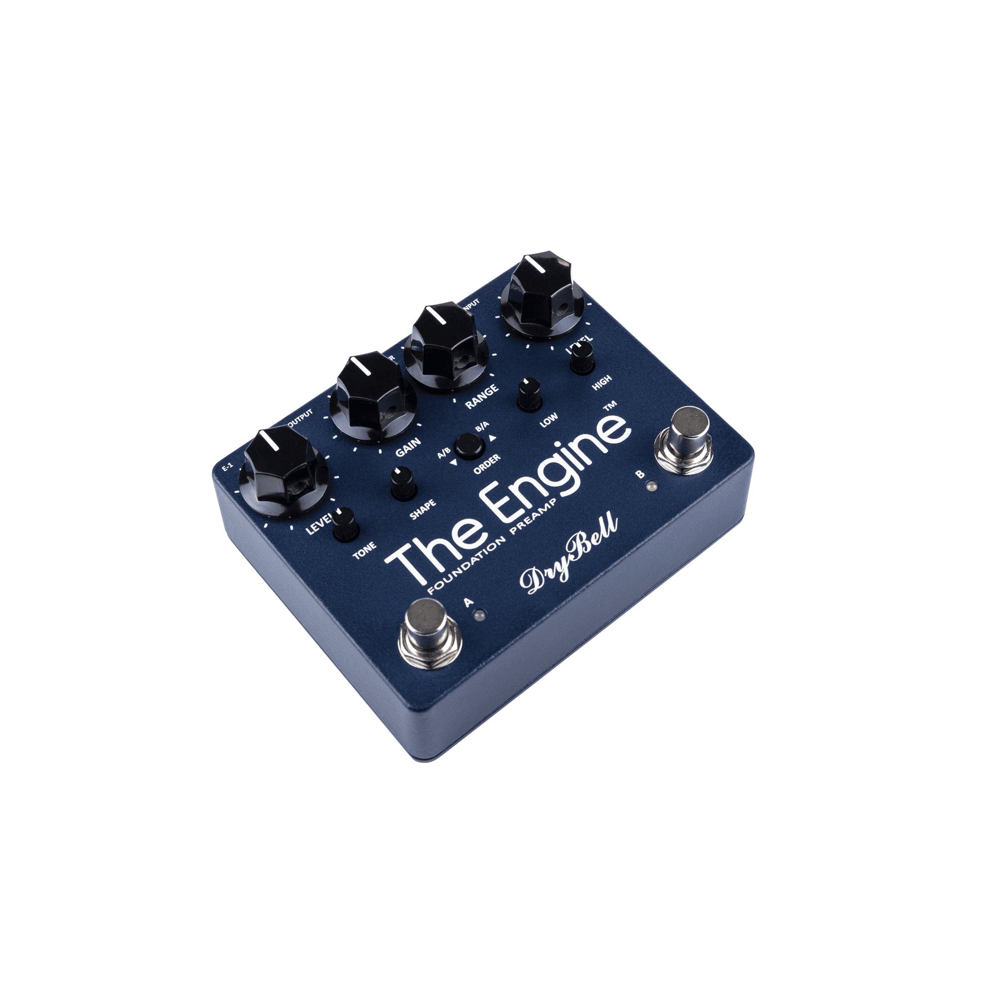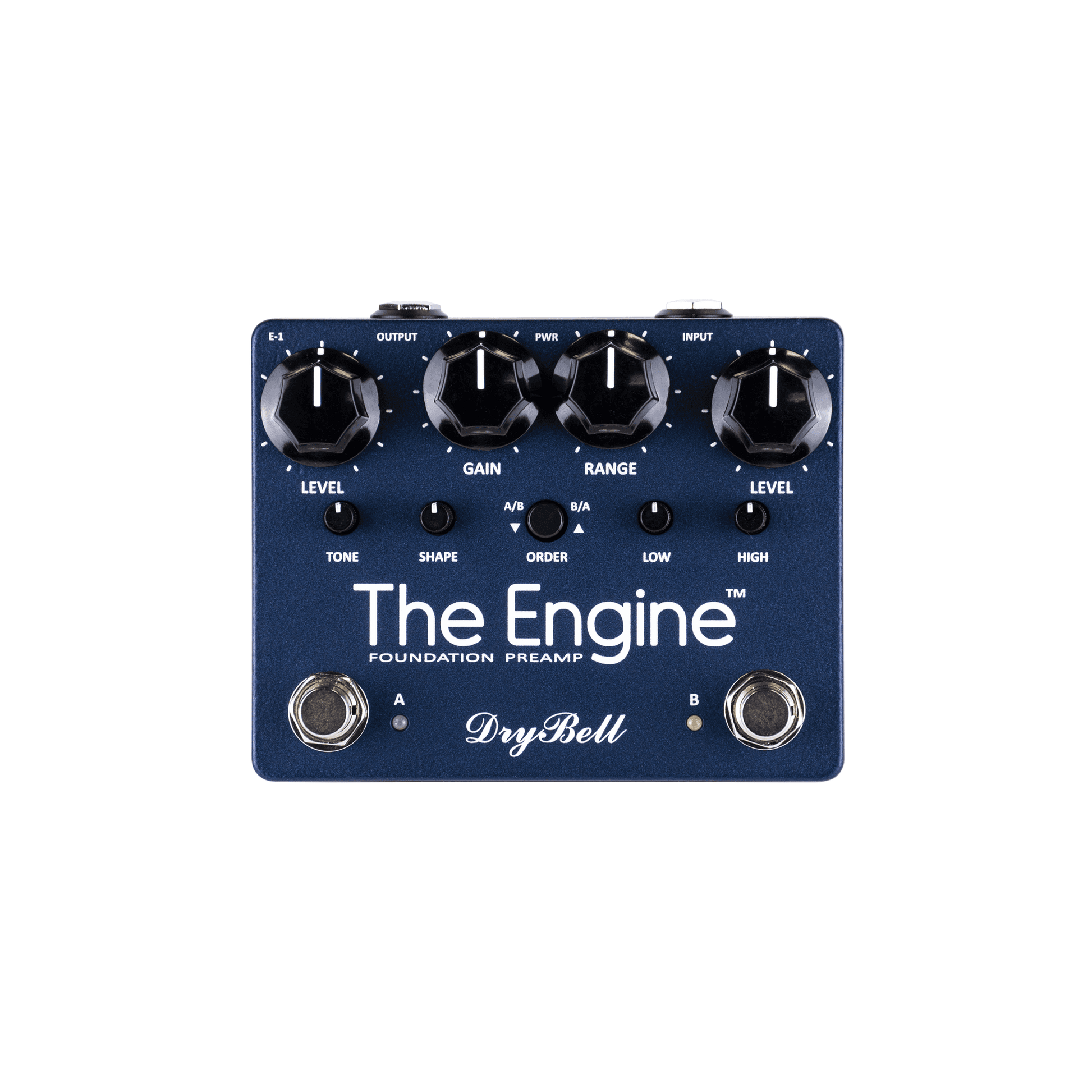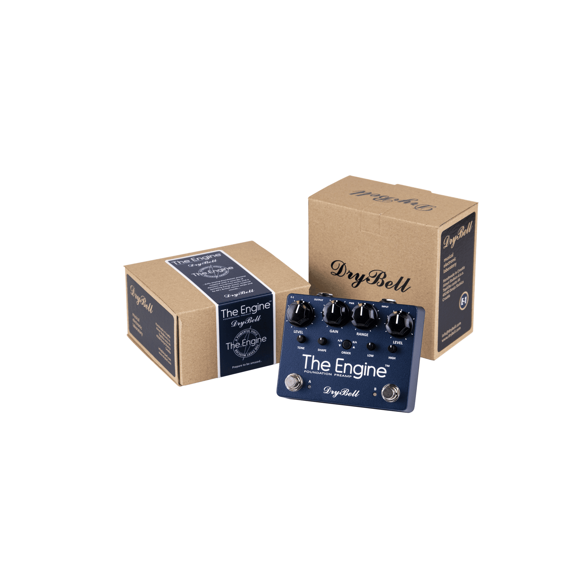 Imagine having a quality, compact go-to pedal to cover all the classic overdriven tones on any type of amp with inspiring results. With that idea in mind, Drybell have created The Engine – a highly versatile and fully analog foundation preamp with distinct voicing inspired by 60’s British classic amps and sounds. It features two very strong & independent sections, designed to work perfectly with a variety of music gear, regardless of your playing style. This unique synergy of dynamic overdriven foundation tone combined with a sparkling Range boost will give you a huge sonic world to explore.