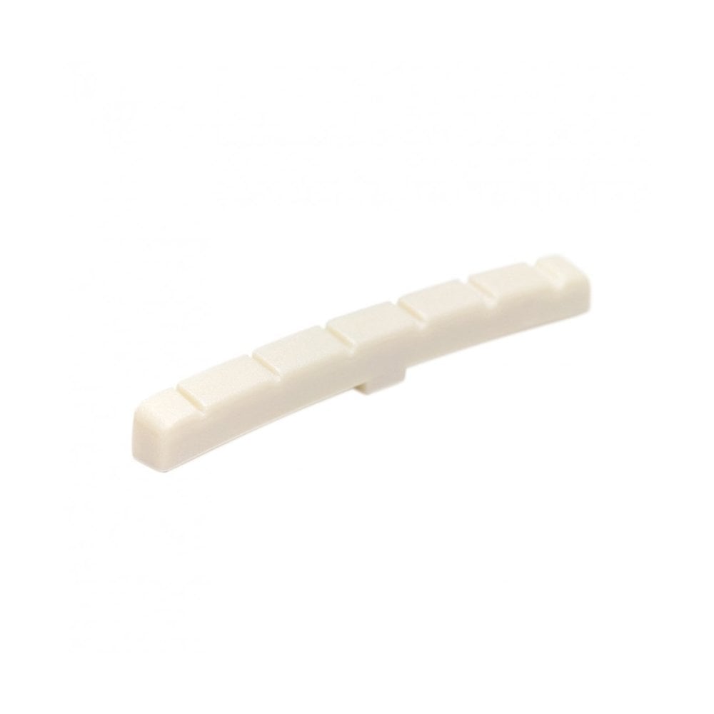 This TUSQ nut fits most American-made and import Strat and Tele style guitars. Features a spacer on the underside for flat nut slot channels or simply sand out the spacer for any neck that has a curved nut slot. The string slots are pre-cut to a 9.5" radius. Graph Tech recommend filing the middle string slots a tiny bit deeper to accommodate necks that have a flatter fingerboard radius, such as 12". We recommend taking the nut and neck to a qualified guitar luthier who can carry this work out for you if you are unsure about modifying the nut.