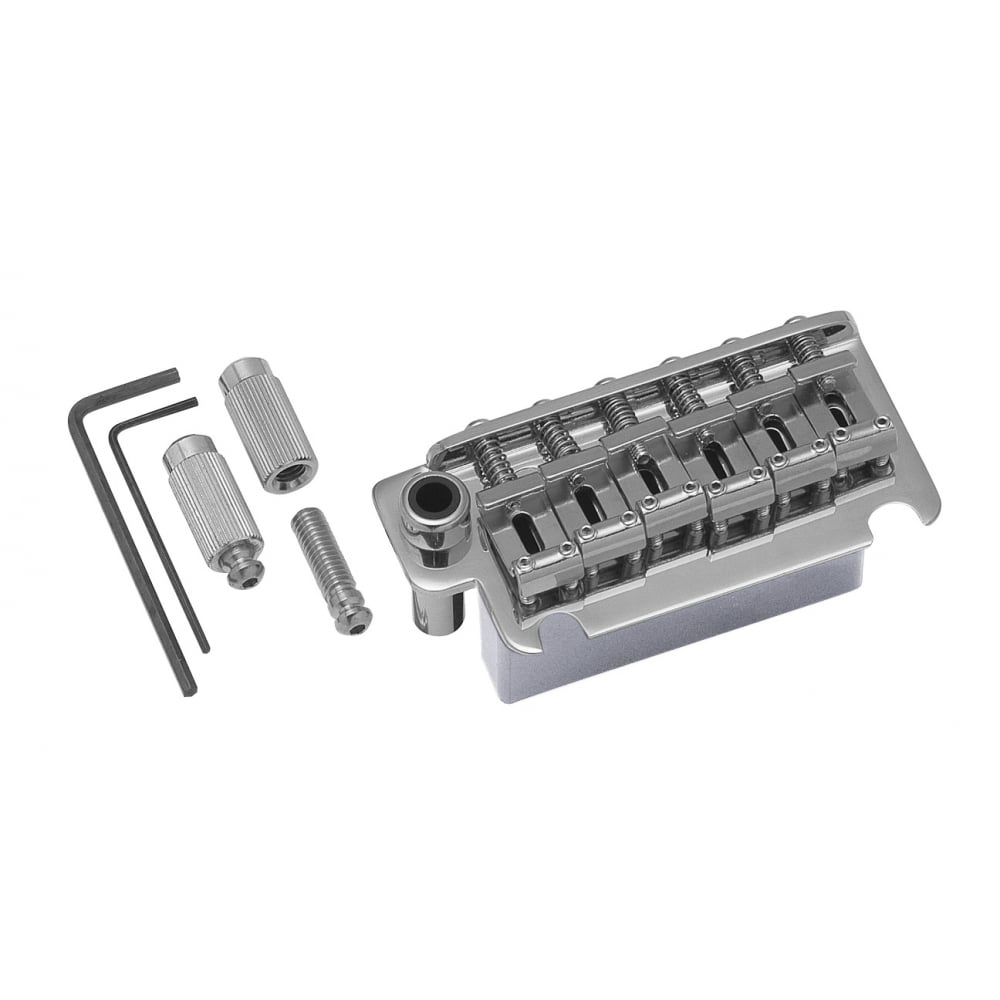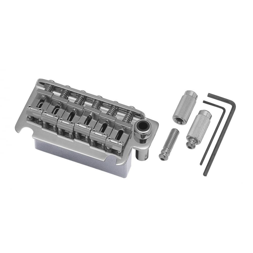 Gotoh contemporary tremolo bridge unit with vintage steel saddles with a solid steel block. Two pivot fulcrum mount. Allen keys, springs, spring claw with screws, arm, mounting posts and inserts are all included. Resilient chromium molybdenum steel base plate and high-grade heat treatment with Gotoh's precision machining all equal up to one of the highest quality tremolo units on the market today.