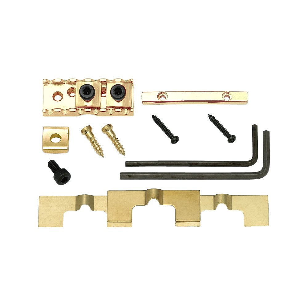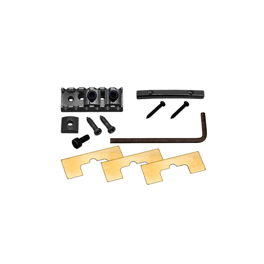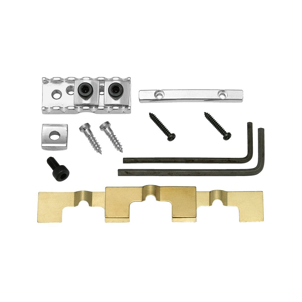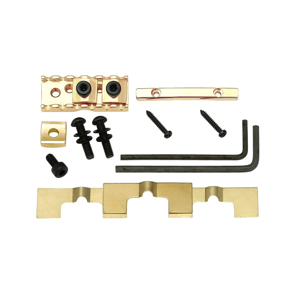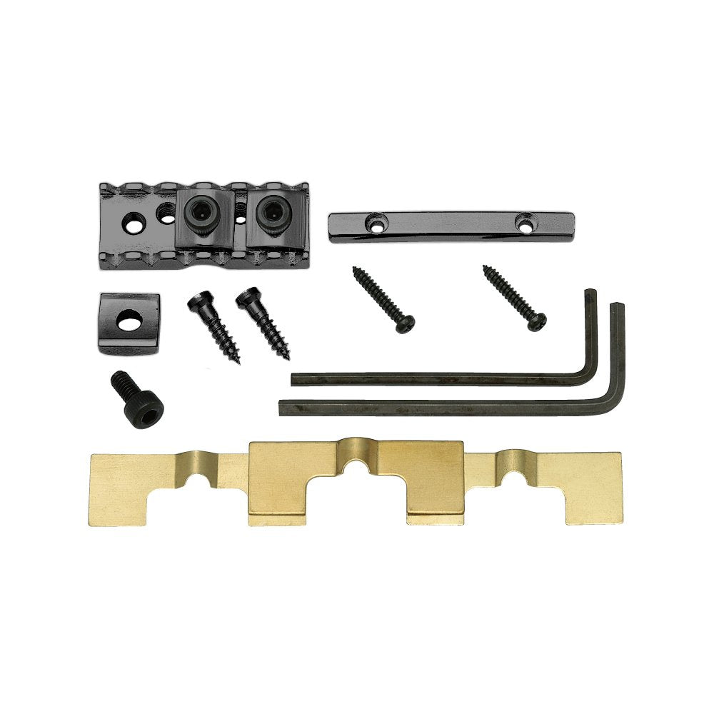 Gotoh Floyd Rose Locking Nut. There are two mounting options to choose from - as standard the lock nut comes with two large bolts that go through the back of the neck. Use the drop down menu to select if you require the smaller mount screws that go through the front of the neck. Comes complete with nut shims, headstock string hold down bar, allen key and all relevant screws.