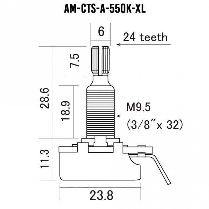 Shaft diameter - 9.5mm (please ensure that the pickguard / control plate that the pot is mounting onto has a 9.6mm diameter hole)