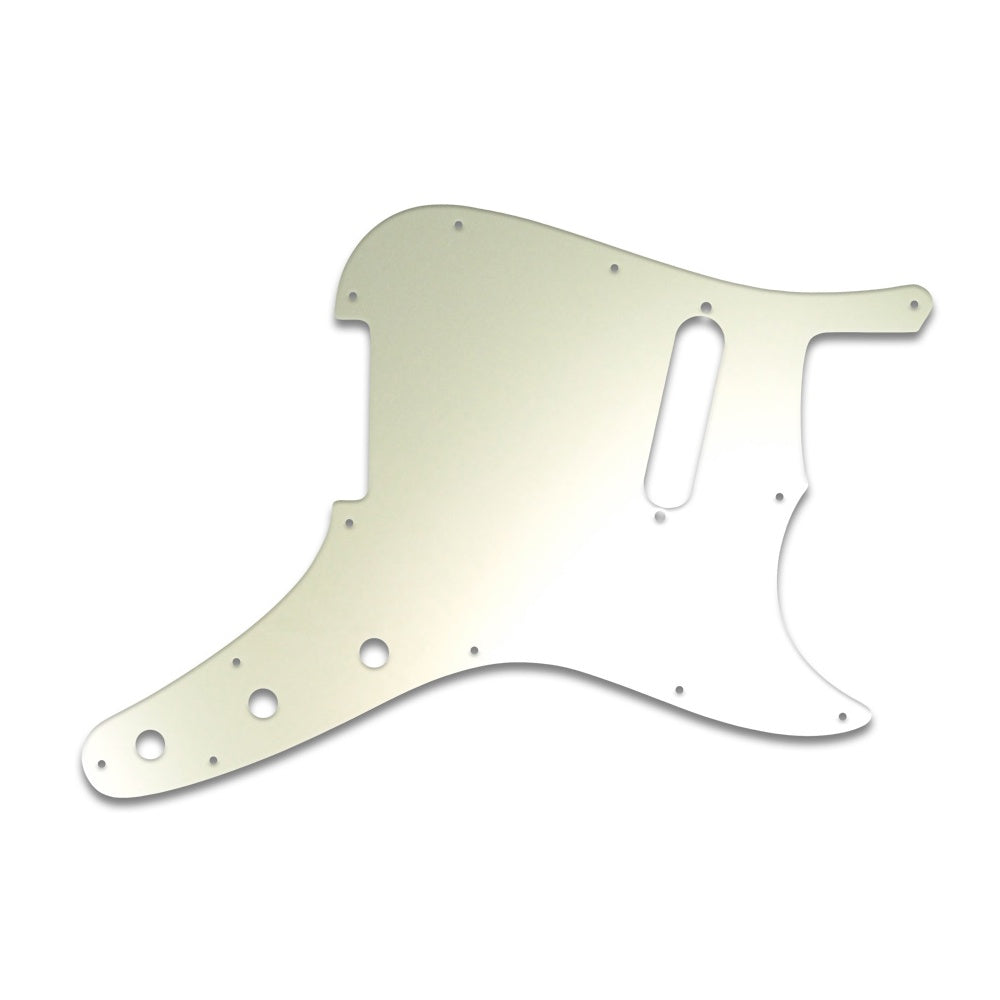 This pickguard is made from silver mirror - a clear acrylic material measuring .118" / 2.99mm thick with a 45 degree bevelled edge. The silver reflective layer is attached to the underside of the acrylic, preventing it from getting scratched or dented once it is fitted to the instrument.