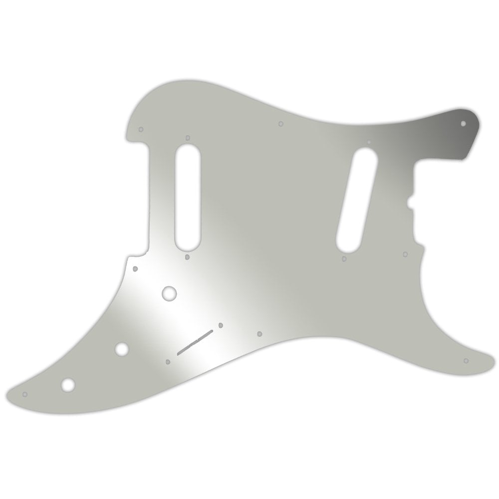 This pickguard is made from silver mirror - a clear acrylic material measuring .118" / 2.99mm thick with a 45 degree bevelled edge. The silver reflective layer is attached to the underside of the acrylic, preventing it from getting scratched or dented once it is fitted to the instrument.