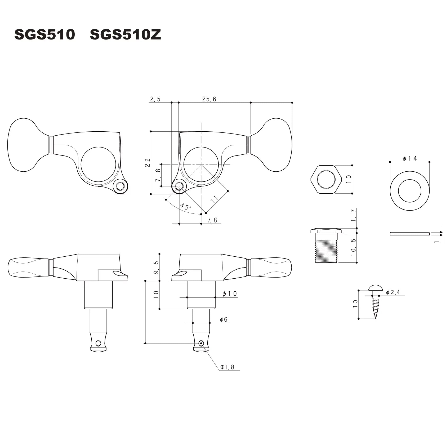 Gotoh's high-end 510 Series 3 per side machine heads with sleek S5 mini buttons, 15:1 gear ratio, lubri-plate coated internal gearing and rock-solid posts for unparalleled tuning stability and smooth operation. This stability is further improved upon with Gotoh's traditional locking posts - simply turn the wheel at the back of the tuner to clamp the string into place, effectively locking it in position to eradicate string slipping and tuning issues. Sold as a set of 6 and comes complete with screws, washers and screw-in bushes.