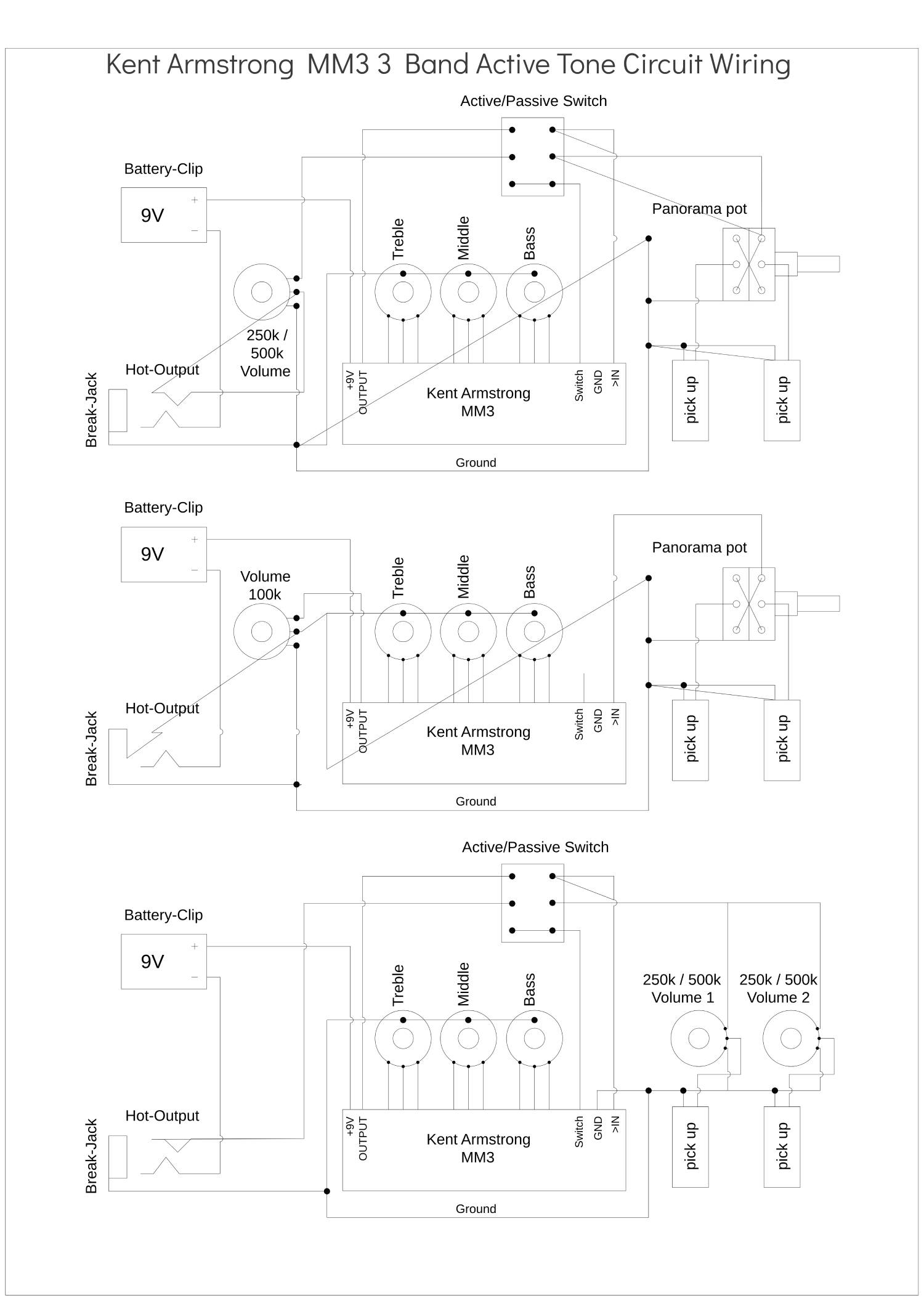 3 band active EQ tone circuit. Three centre detent mini pots offering bass cut and boost, middle cut and boost and treble cut and boost. The pots are solid shaft for knobs that have a grub screw. Click here for wiring diagram.