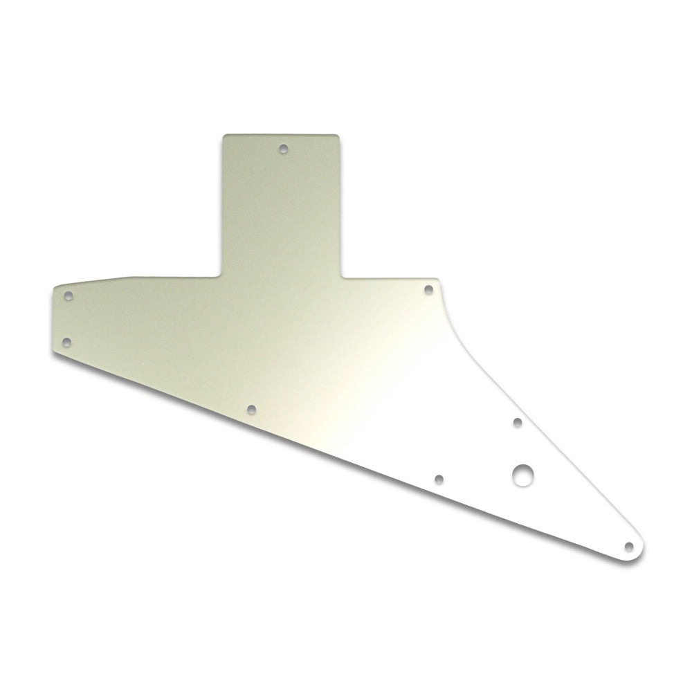 This pickguard is made from silver mirror - a clear acrylic material measuring .118" / 2.99mm thick with a 45 degree bevelled edge. The silver reflective layer is attached to the underside of the acrylic, preventing it from getting scratched or dented once it is fitted to the instrument.