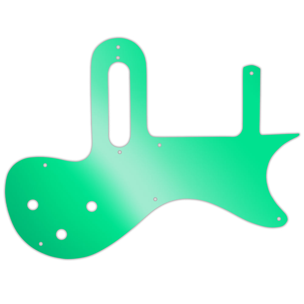 This pickguard is made from green mirror - a clear acrylic material measuring .118" / 2.99mm thick with a 45 degree bevelled edge. The green reflective layer is attached to the underside of the acrylic, preventing it from getting scratched or dented once it is fitted to the instrument.