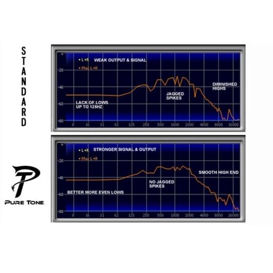 The Pure Tone jack contains dual tension grounds and dual positive tips for optimal signal and lowest possible noise. 100% greater surface area at all contact points creates a more stable connection; as a result, high and low frequencies are greatly improved creating a much more balanced sound while eliminating frequency spikes. No more noise crackle caused by pressure grounds!