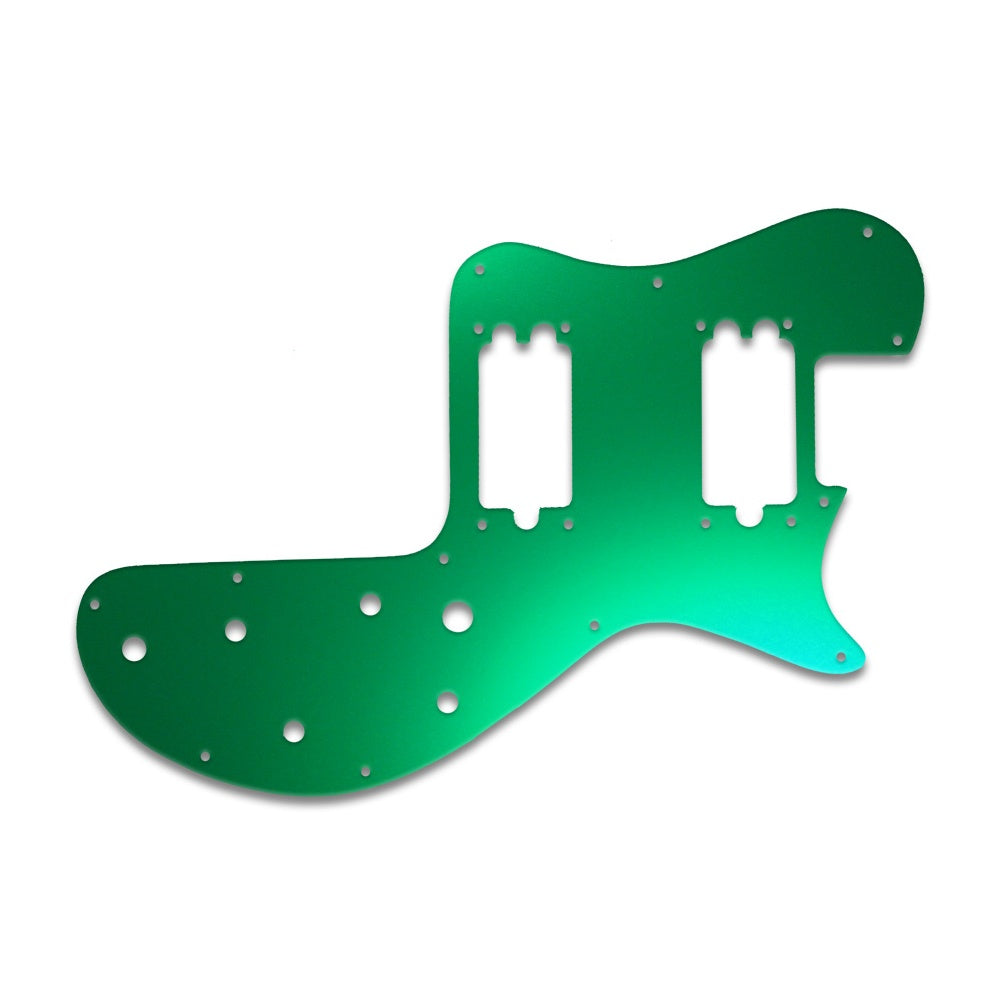 This pickguard is made from green mirror - a clear acrylic material measuring .118" / 2.99mm thick with a 45 degree bevelled edge. The green reflective layer is attached to the underside of the acrylic, preventing it from getting scratched or dented once it is fitted to the instrument.