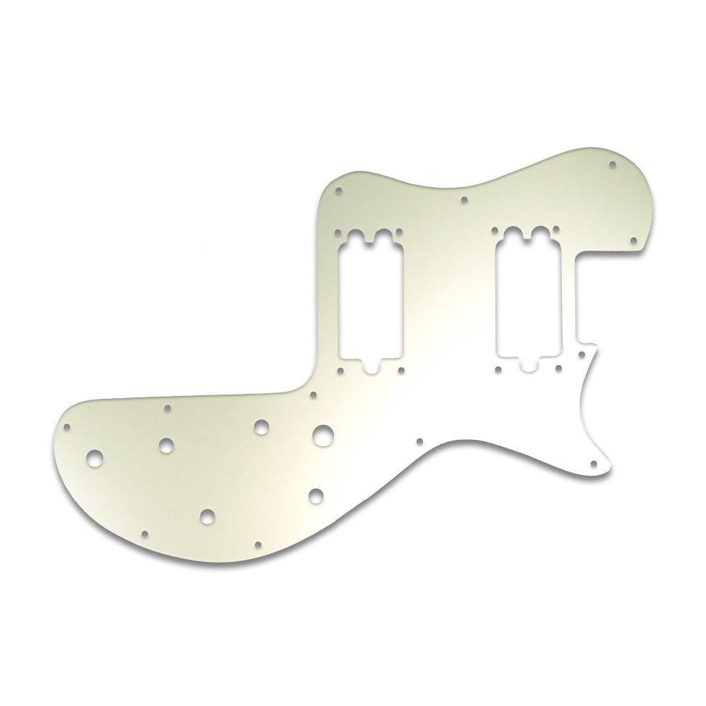 This pickguard is made from silver mirror - a clear acrylic material measuring .118" / 2.99mm thick with a 45 degree bevelled edge. The silver reflective layer is attached to the underside of the acrylic, preventing it from getting scratched or dented once it is fitted to the instrument.