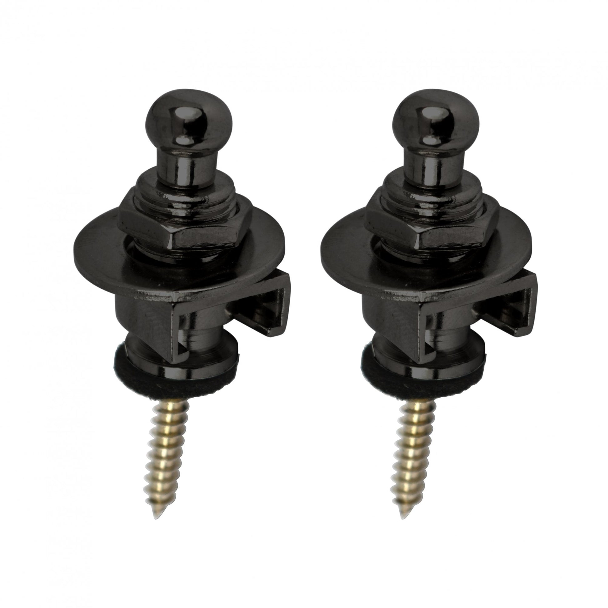 Set of two strap locks, with matching buttons, mounting screws and large washer and nut to securely attach the mechanism to the strap. Also included are two black felt washers to prevent the strap buttons from marking the guitar body. This strap lock system firmly locks the guitar strap to the guitar. The spring-loaded mechanism frees the guitar with a quick pull of the button.